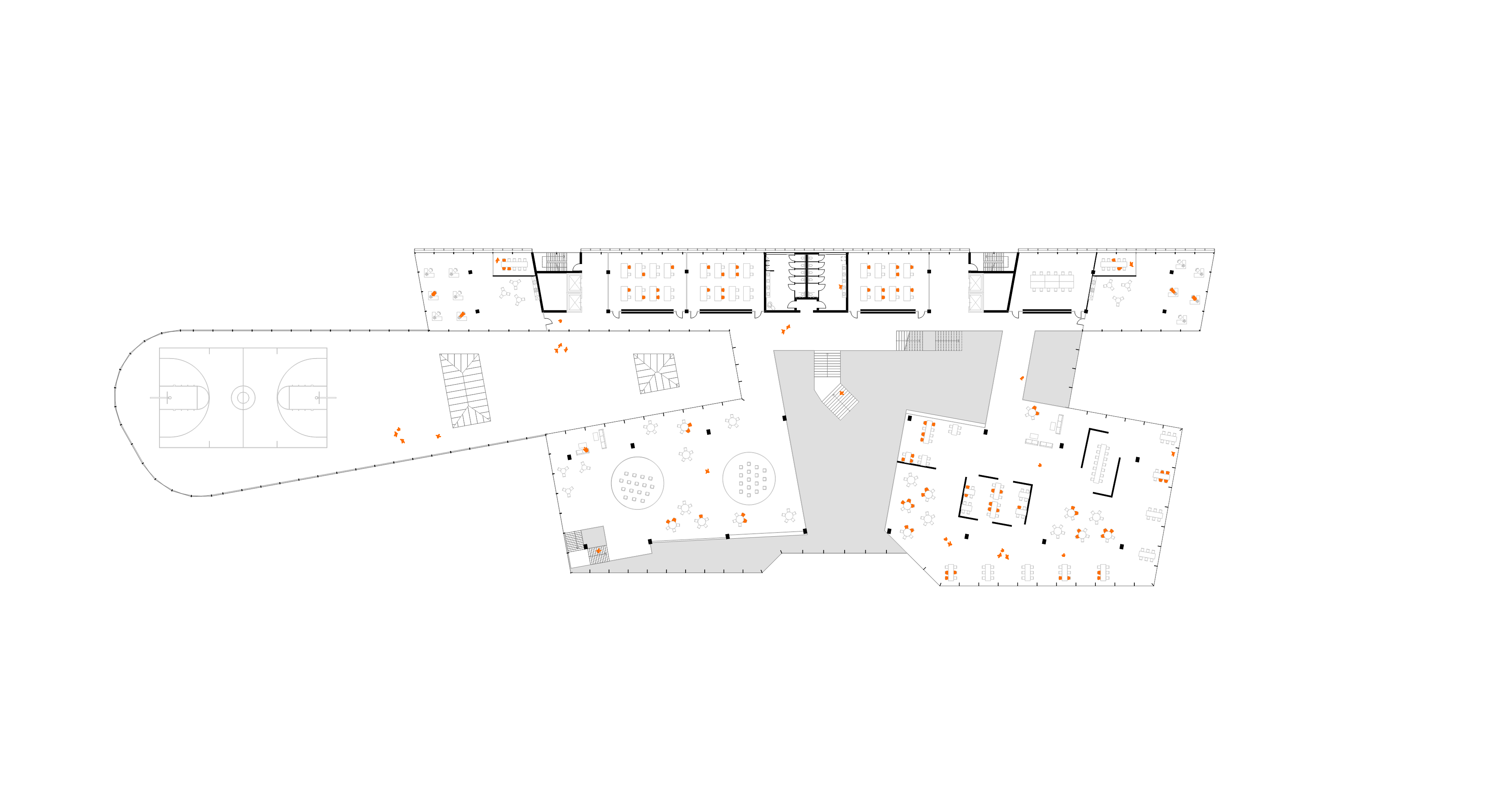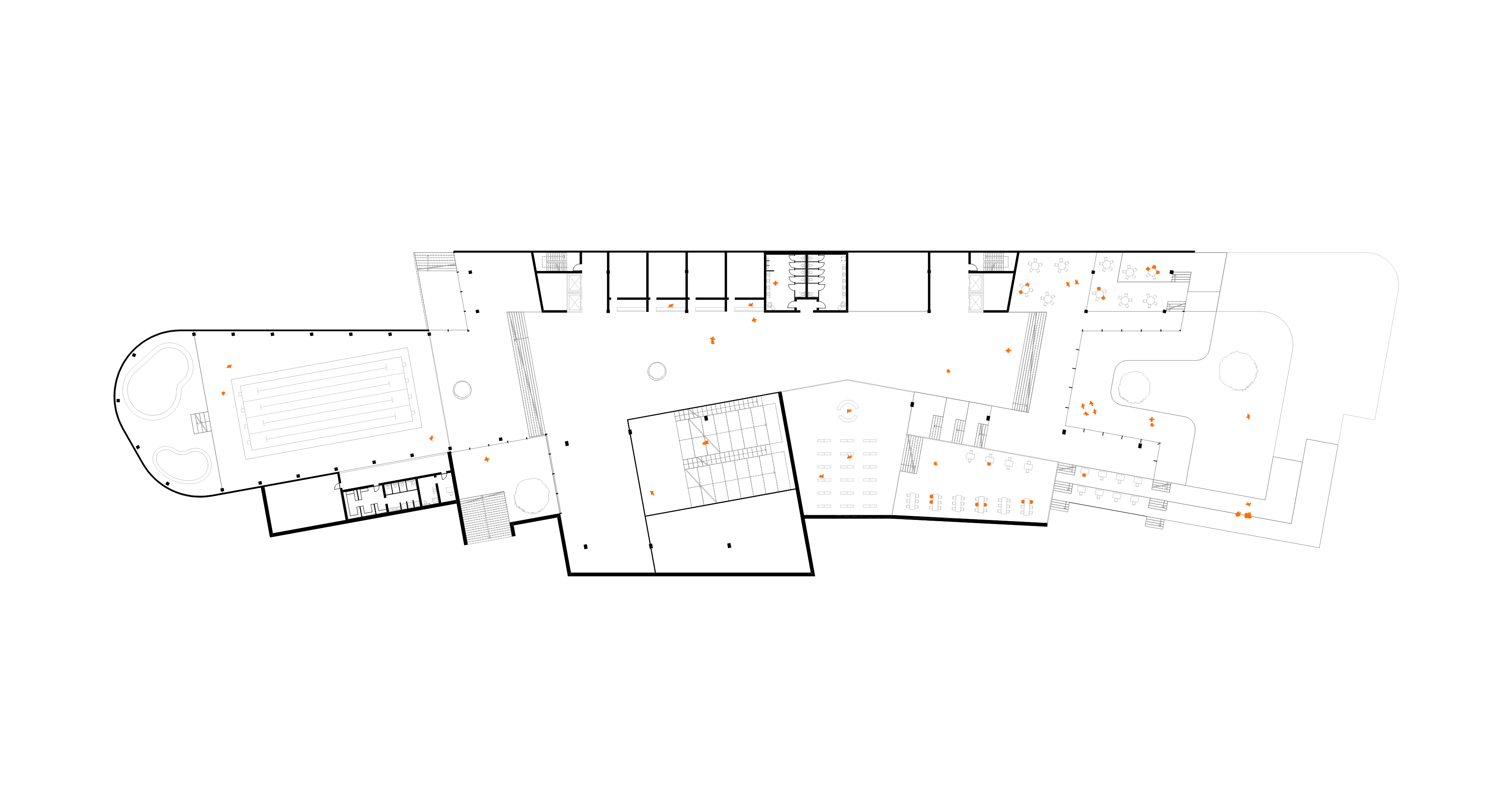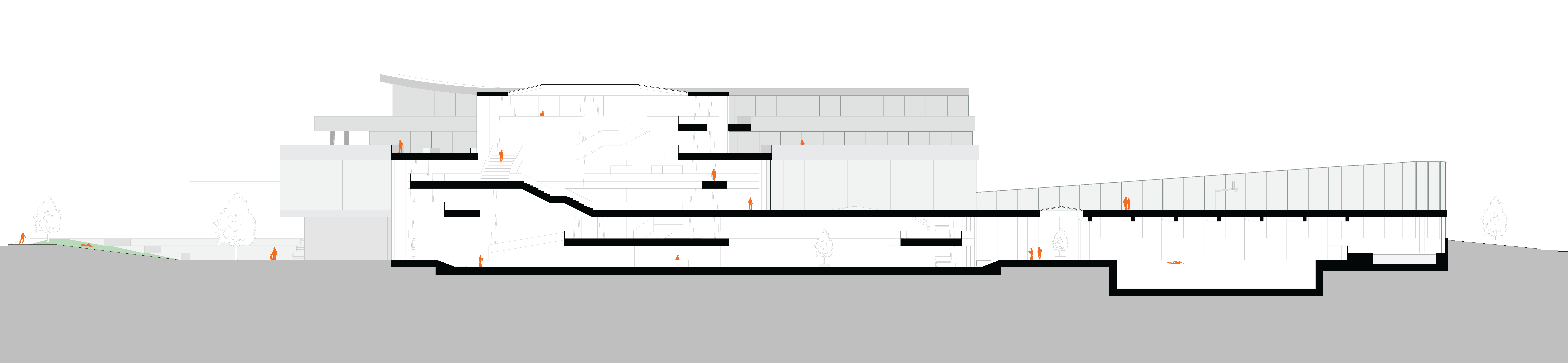 The low spot at the southern end is extremised to provide a public retreat from the urbanised surroundings. The resulting leaps in height create a dissolved ground plane that is intended to encourage visitors to explore. Wandering through the building, one quickly recognises a wide variety of recreational qualities, such as a street food mile, library and swimming pool.