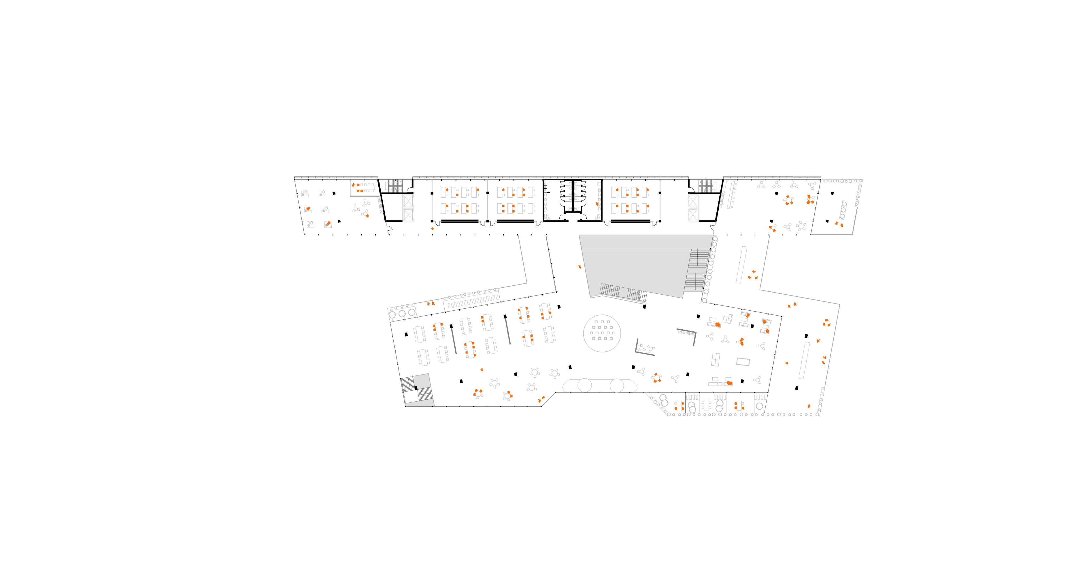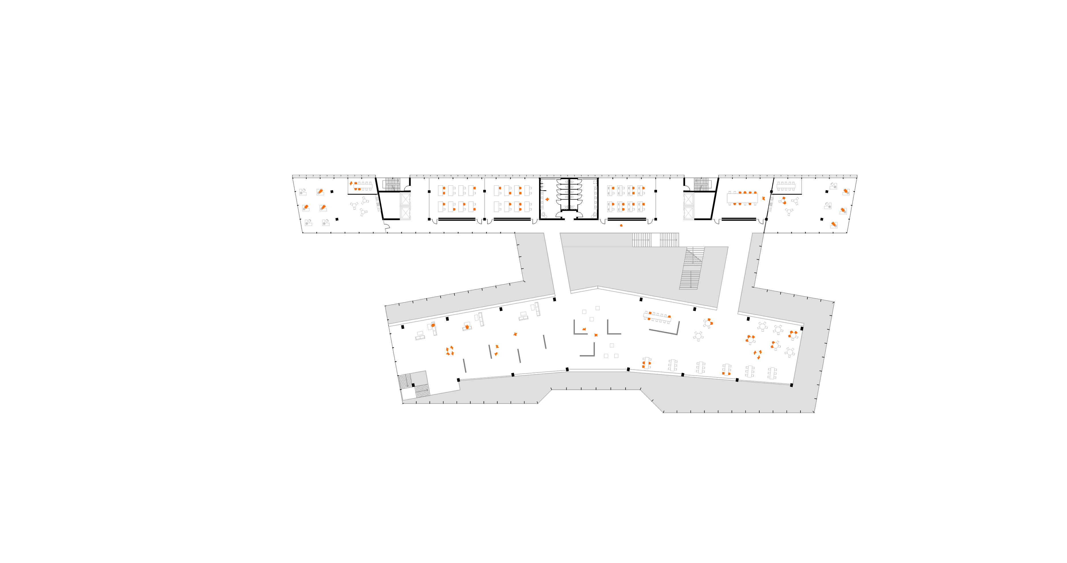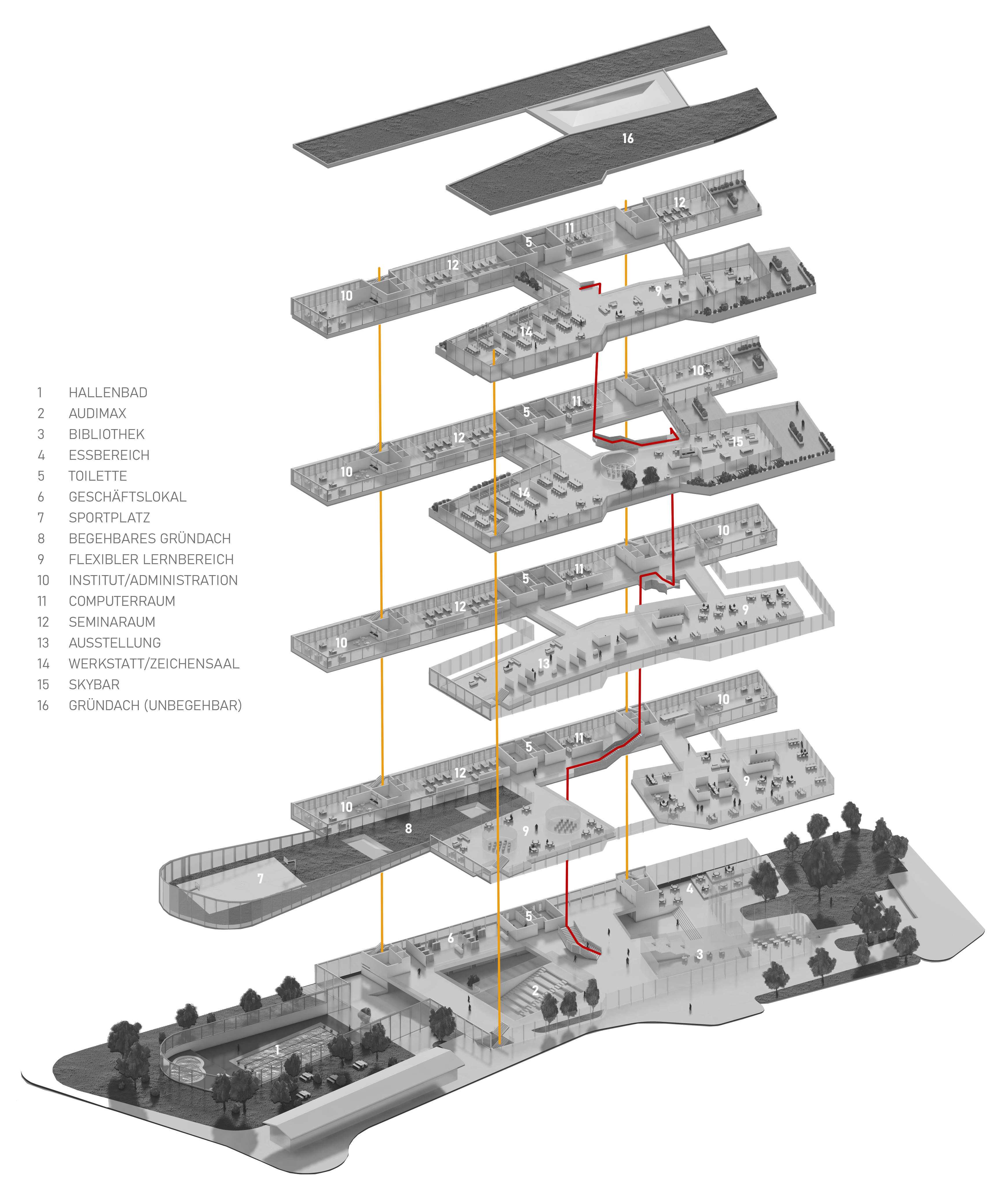 The building is divided into 4 elements: a mixed-use development wing, which is docked to an access atrium that connects a strictly structured teaching wing with a structurally dissolved student block.