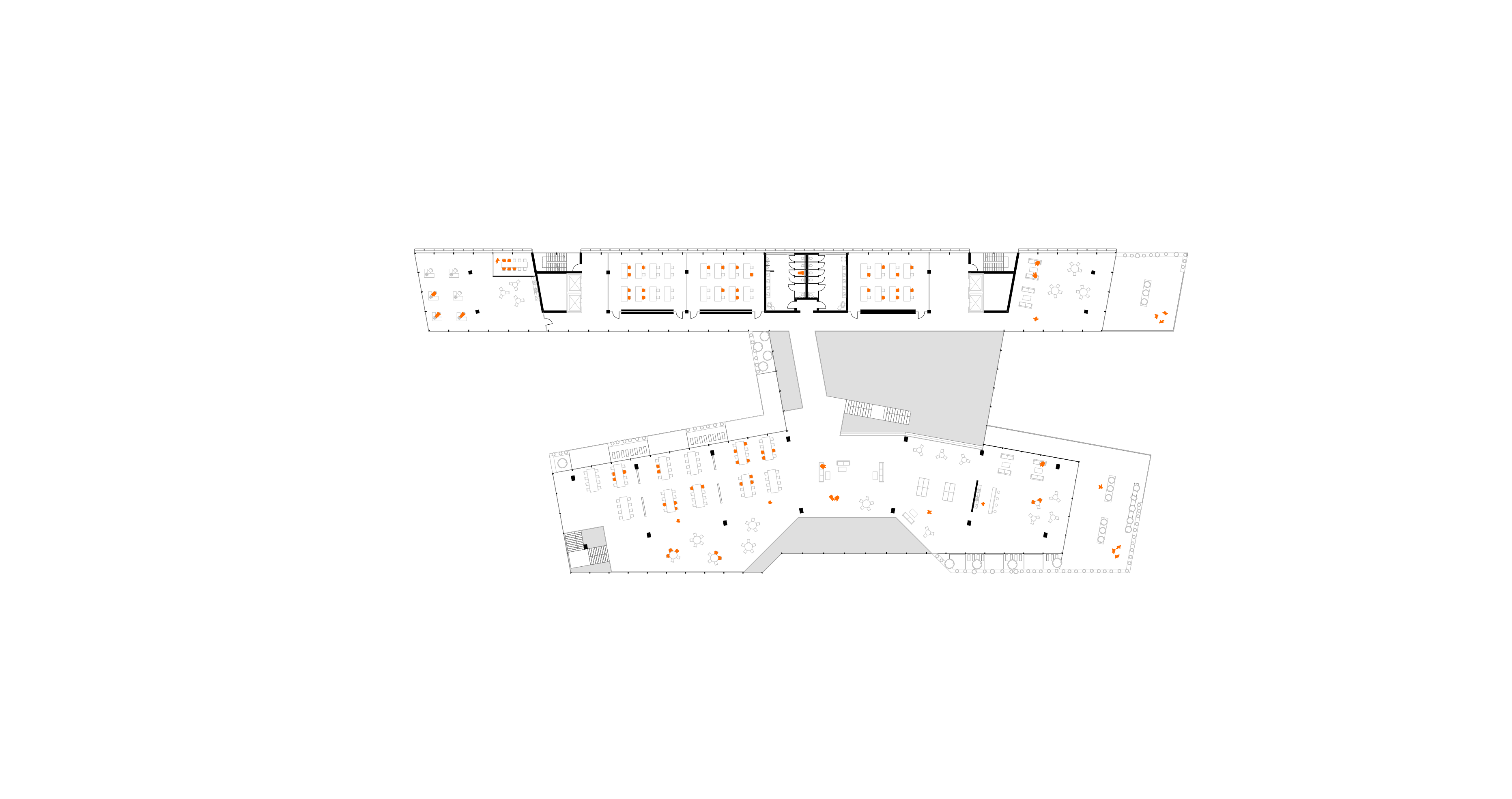 The principle of spatial continuity can be felt throughout the building. On the one hand, the idea of space is fundamentally questioned in this project. fundamentally questioned in this project. The sturcture of the north block, which is typical for a university, makes the of the north block, the free floor plan in the south block is made possible. The boundary between the interior and the exterior dissolves, the “south” is virtually drawn through the entire building.