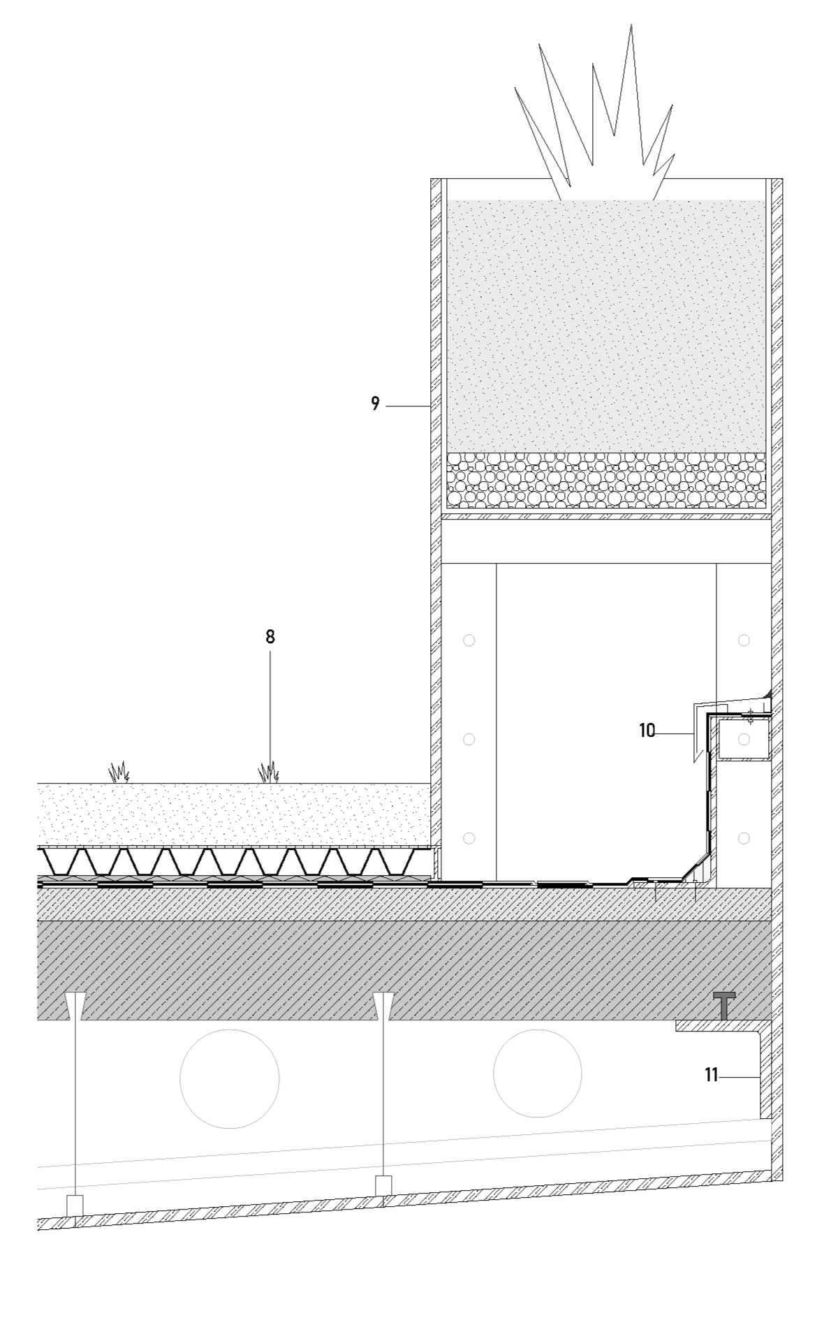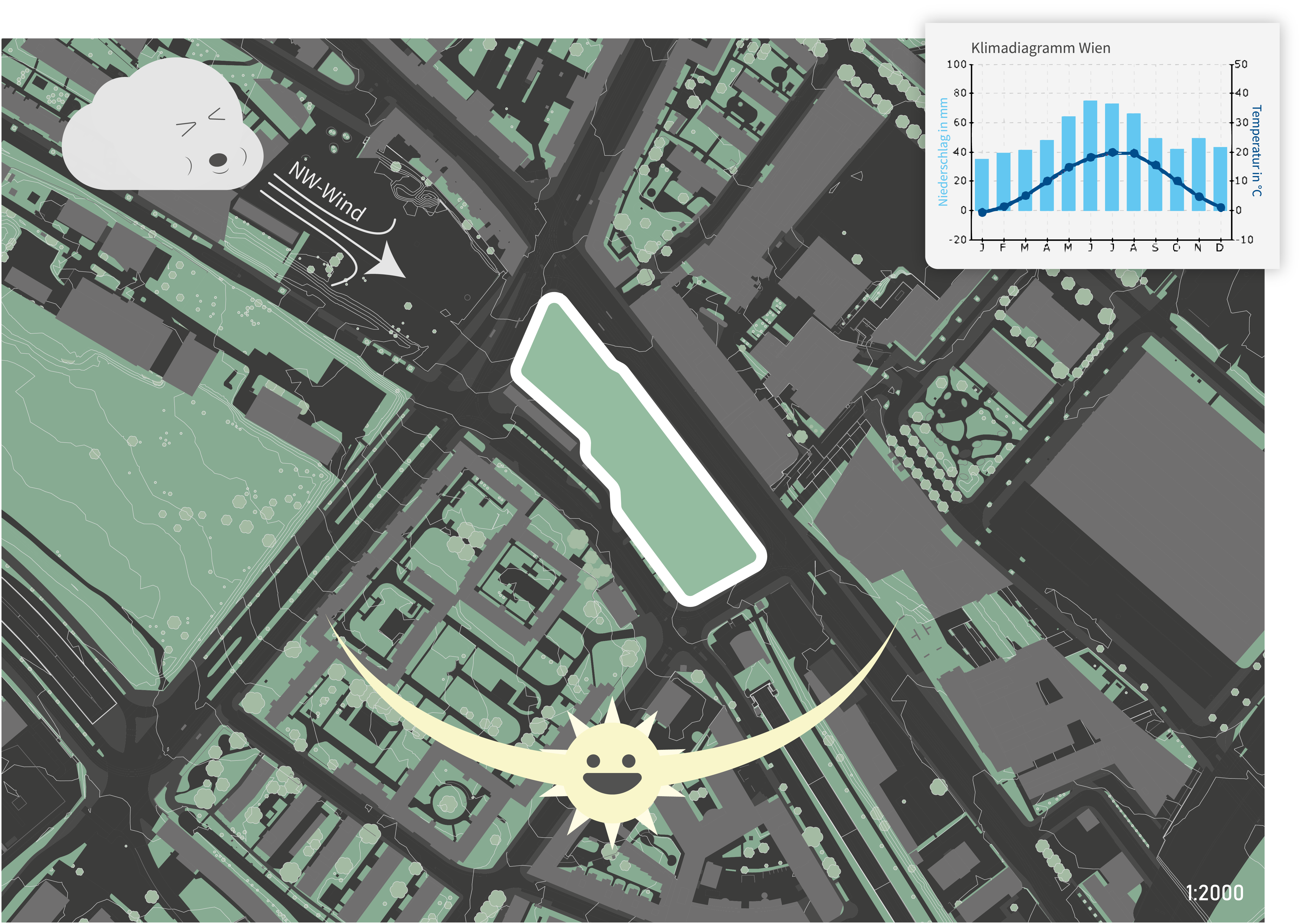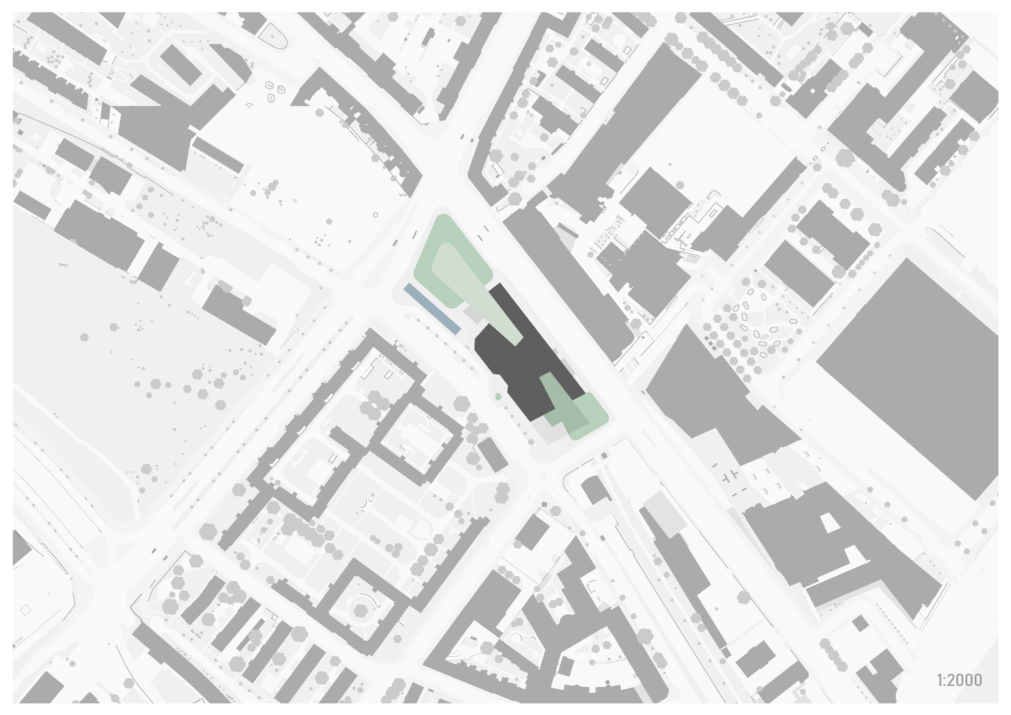 If one compares the course of the heights on the building site with the storey heights of the project, one immediately recognises the close connection. The accessible green roof on the 1st floor is intended to represent the existing hill of the building site and provide green space for the city interior, as it originally did.