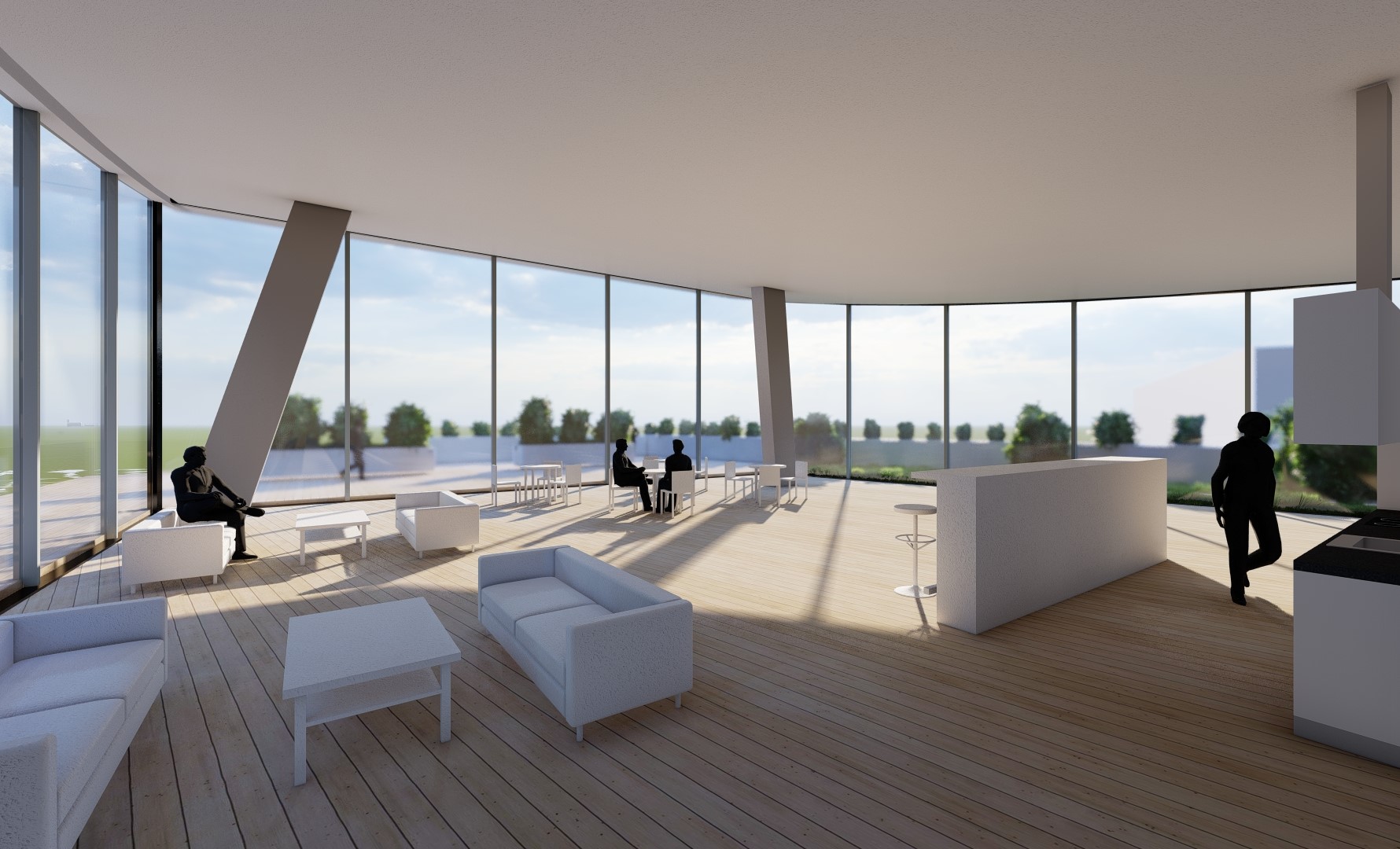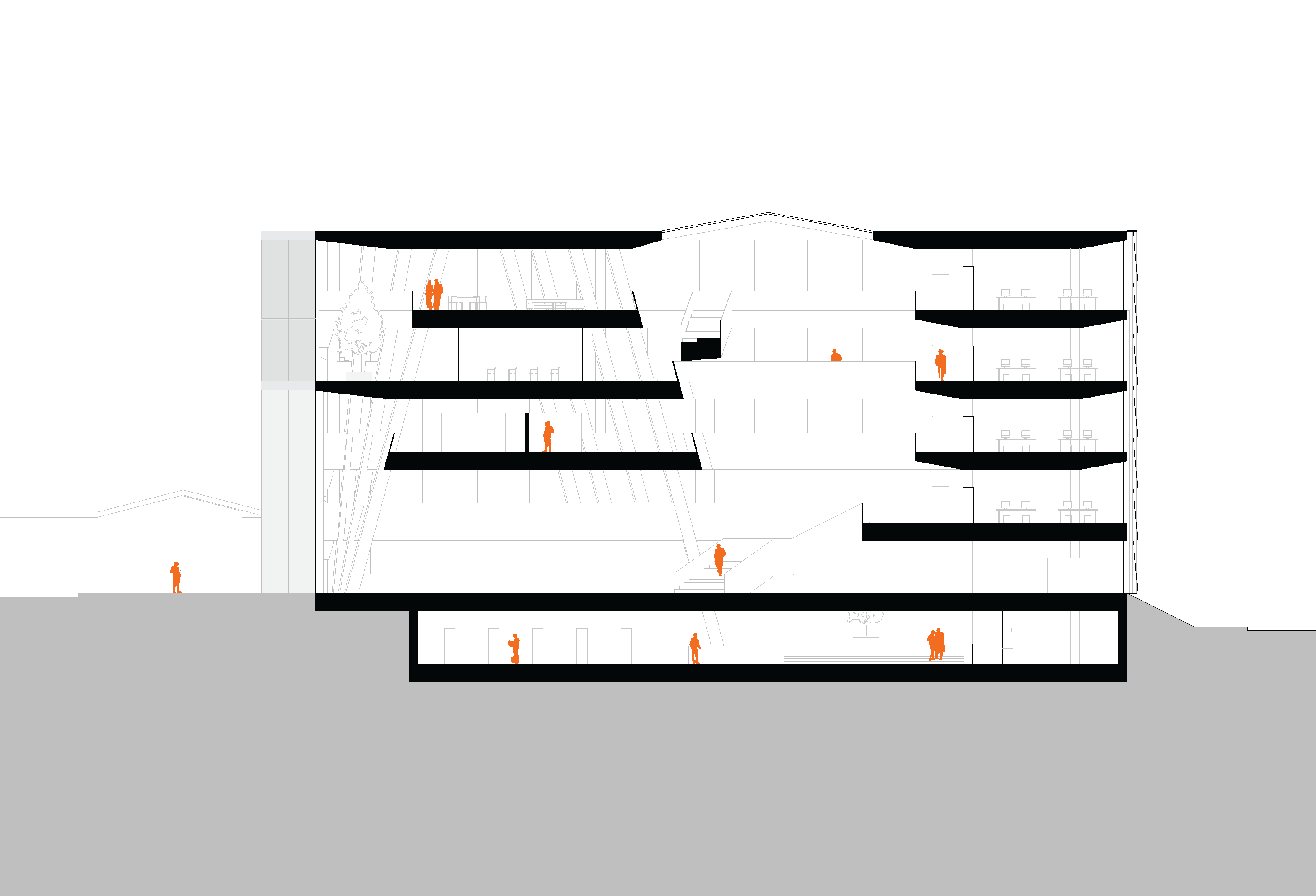 To make the interior legible to the outside, the façade should represent accessibility and let in as much light as possible. At the same time, the levels to the south shade themselves in such a way that direct sunlight is avoided in summer and the sun allows the interior to be heated in winter.