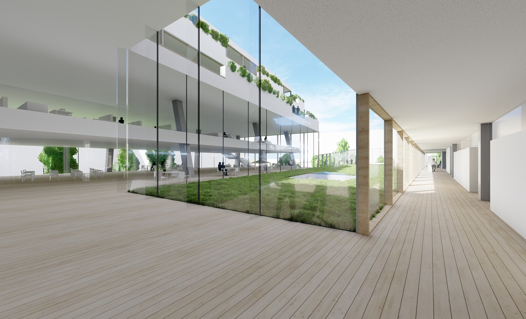 To the north, on the other hand, there is a double façade along the teaching wing, which is intended firstly to provide an audiovisual block to the busy country road and secondly to naturally support the building’s ventilation.