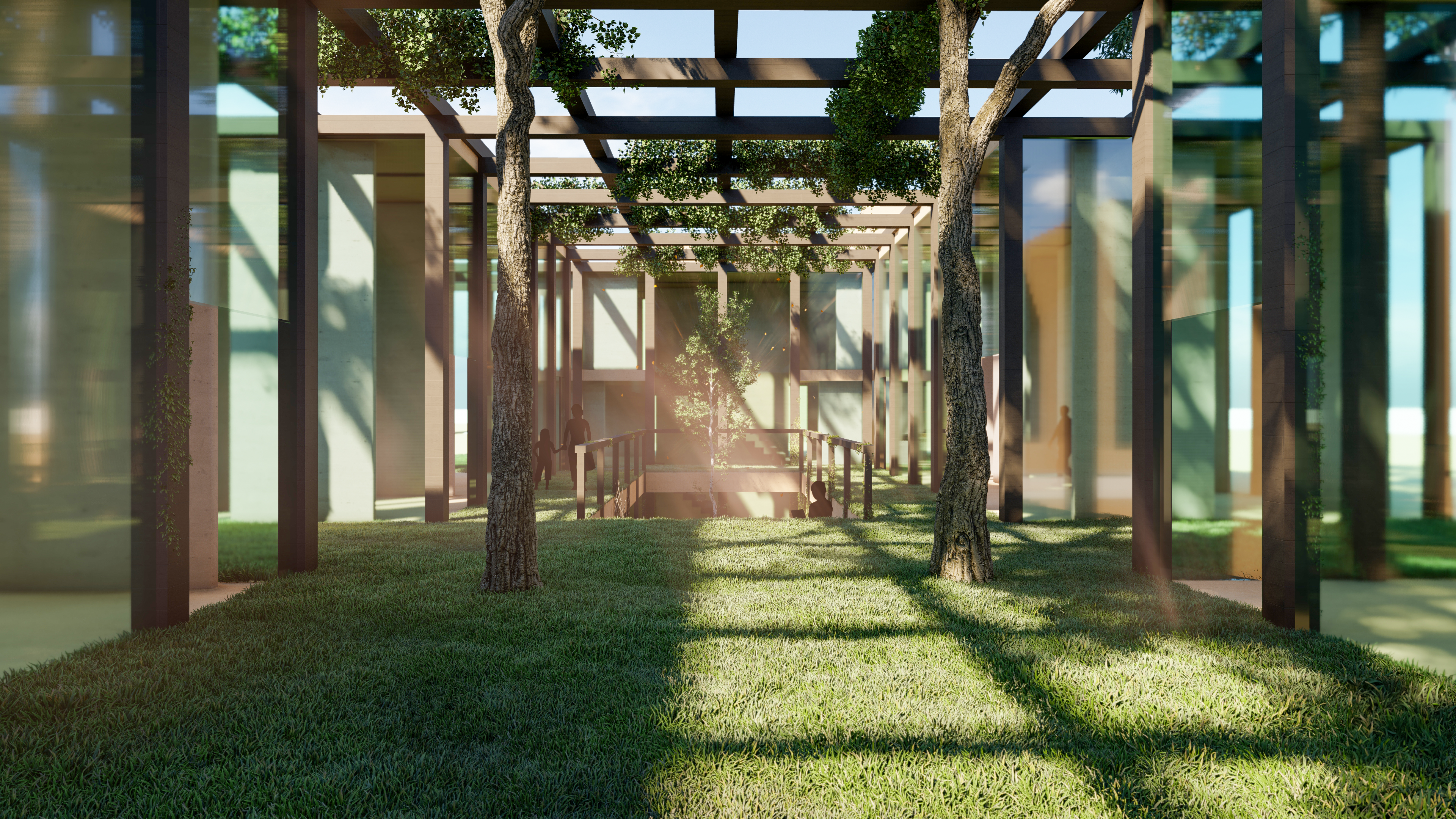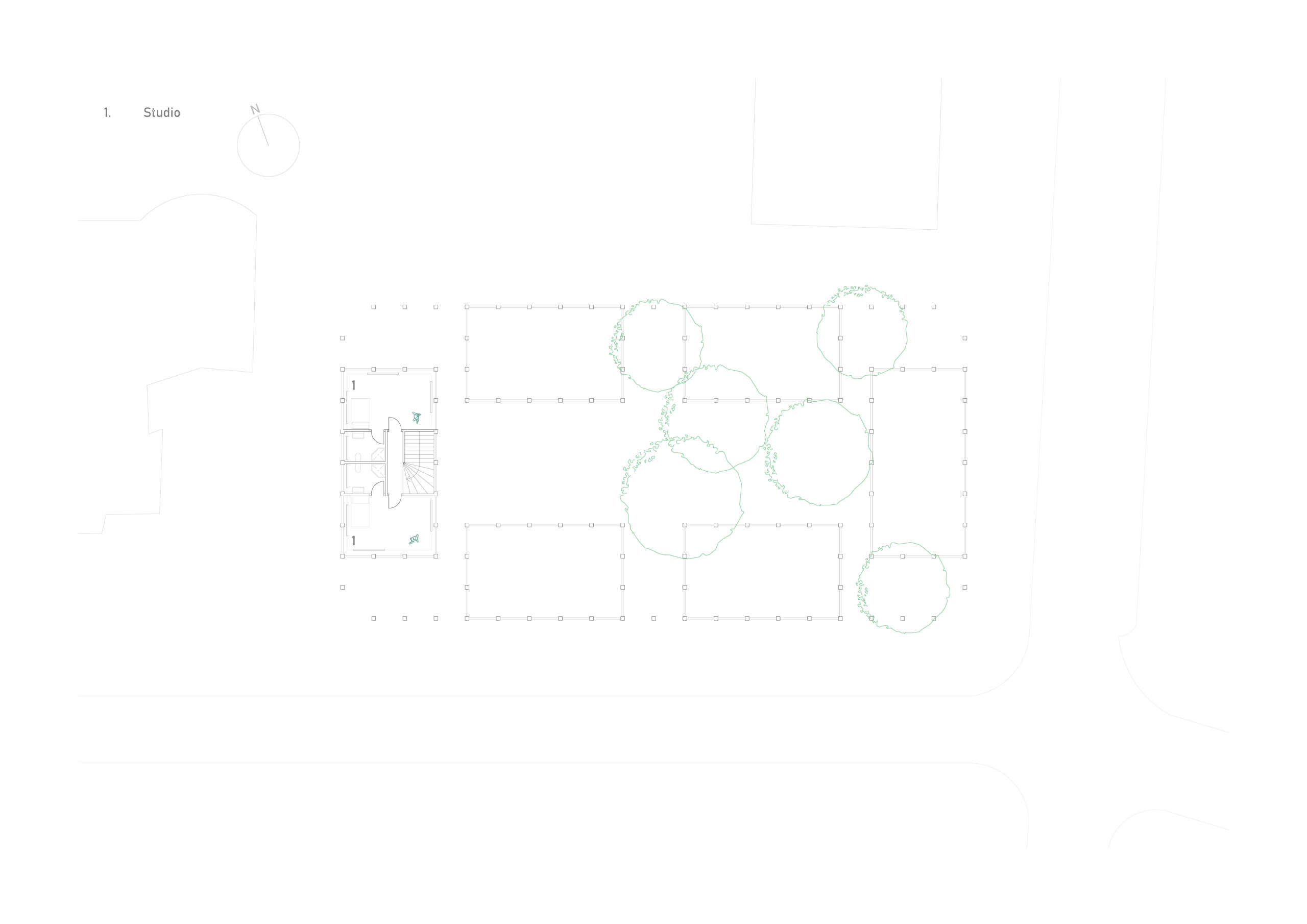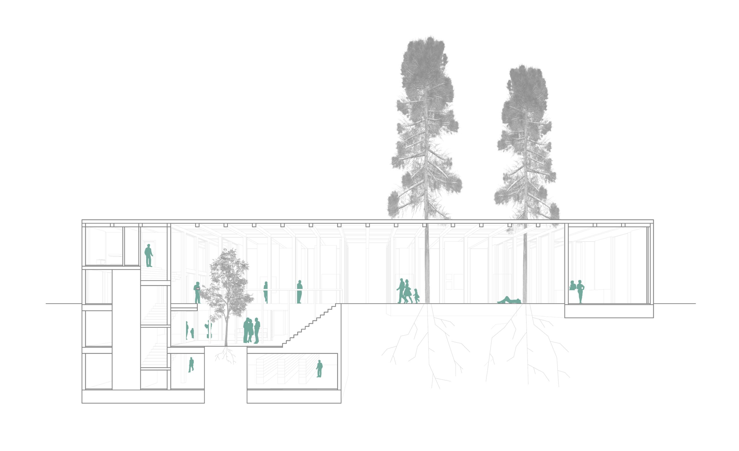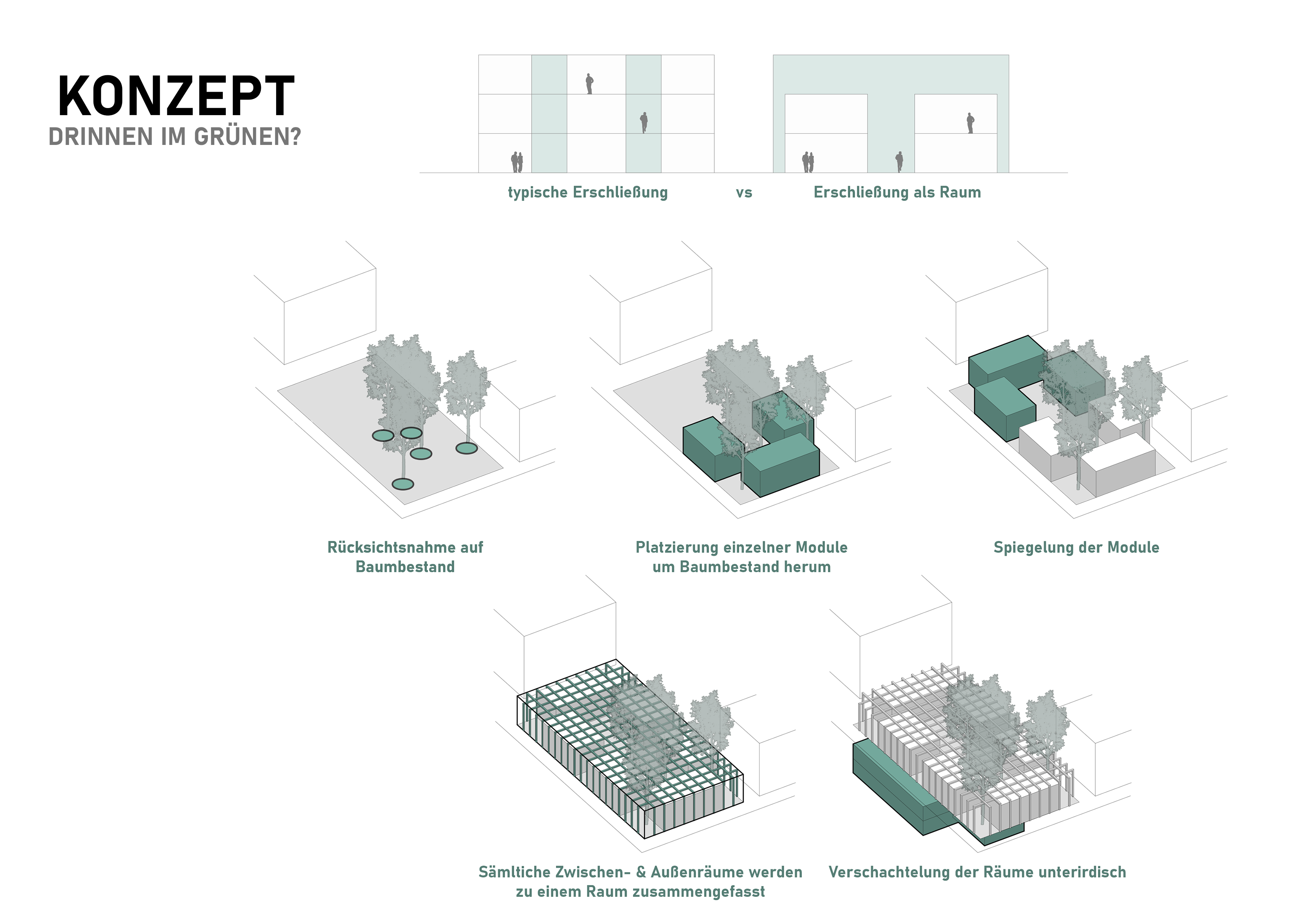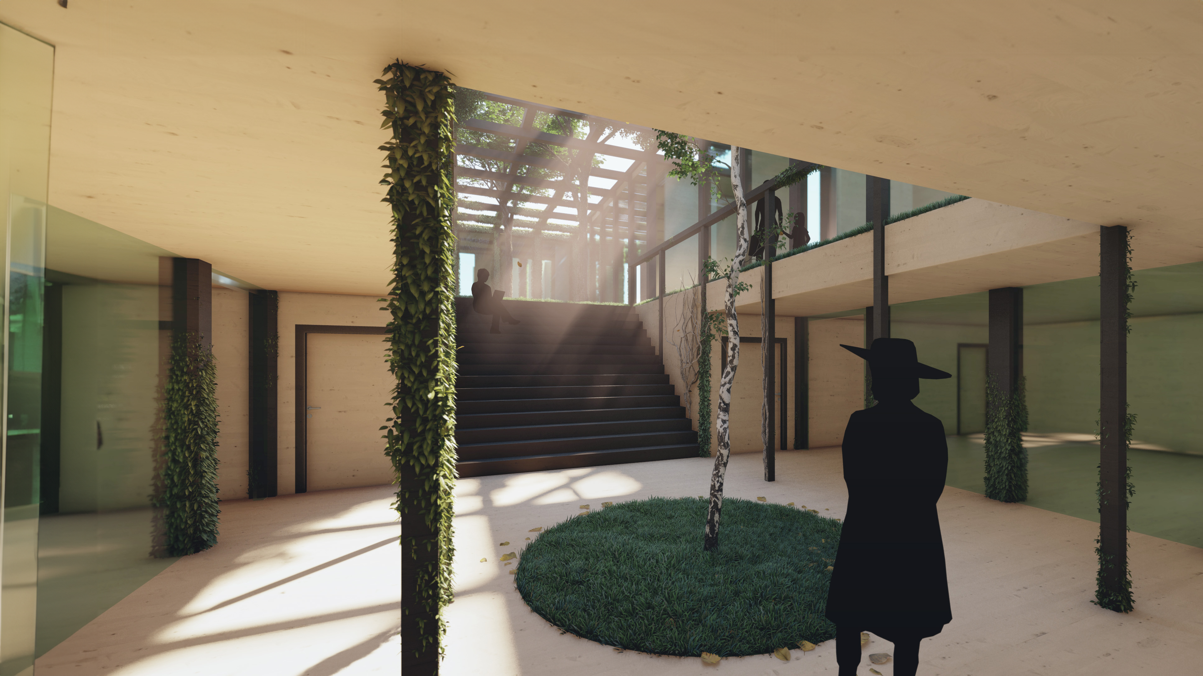 The arrangement is mainly given by the existing trees, which are essential for the emerging inner courtyard. It is intended to form the heart of the project, which is created by the reflection of the emerging form through the trees. At the same time, this courtyard will also be extended into the basement via an opening.