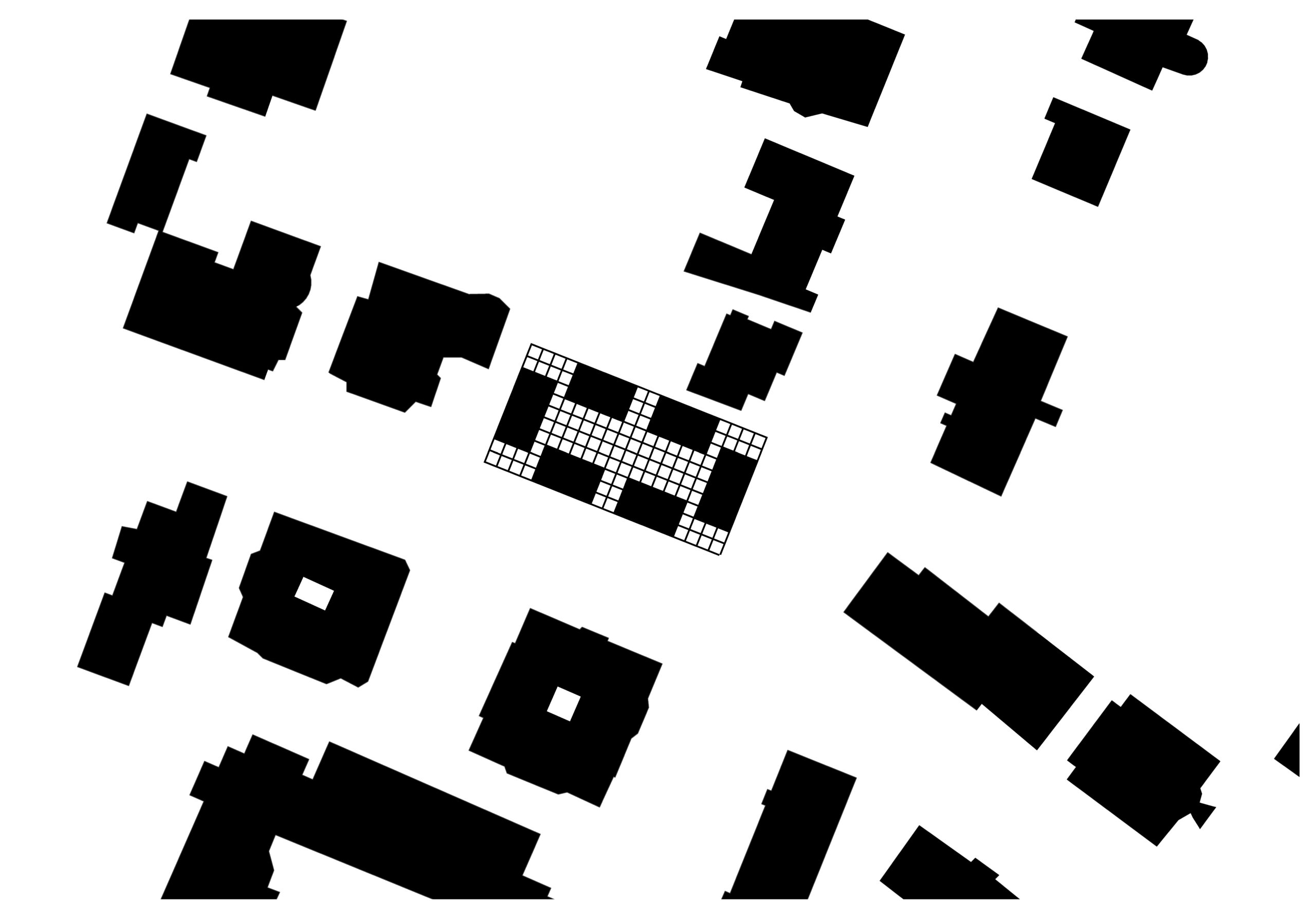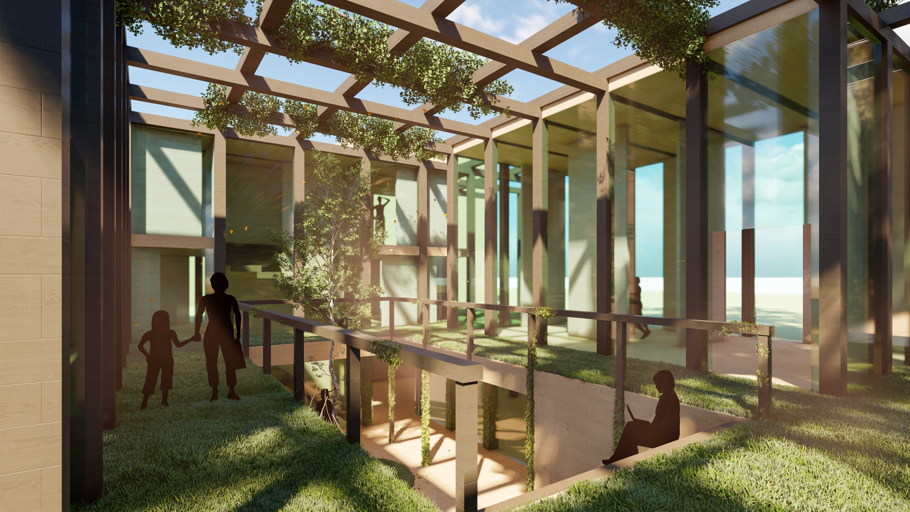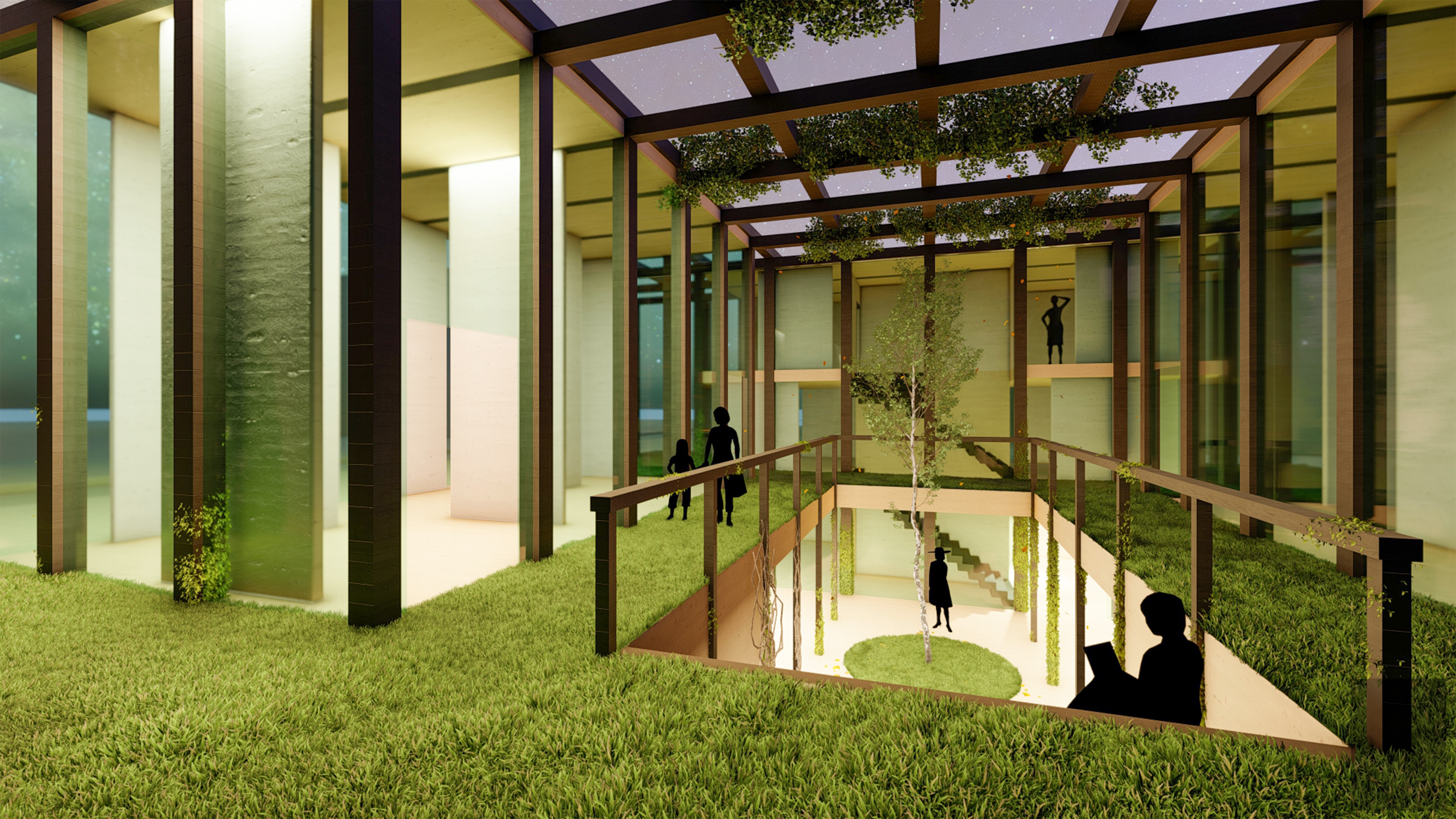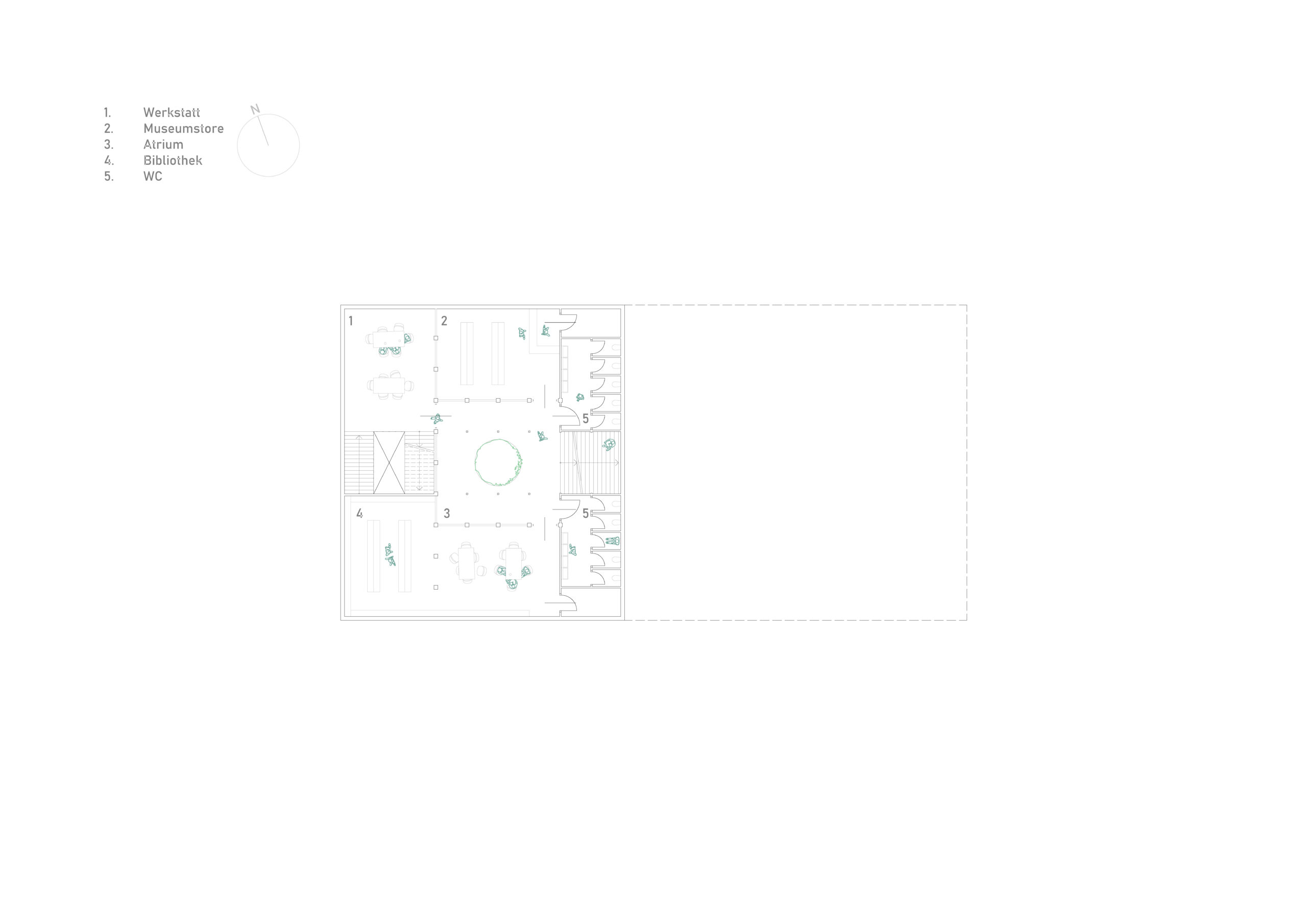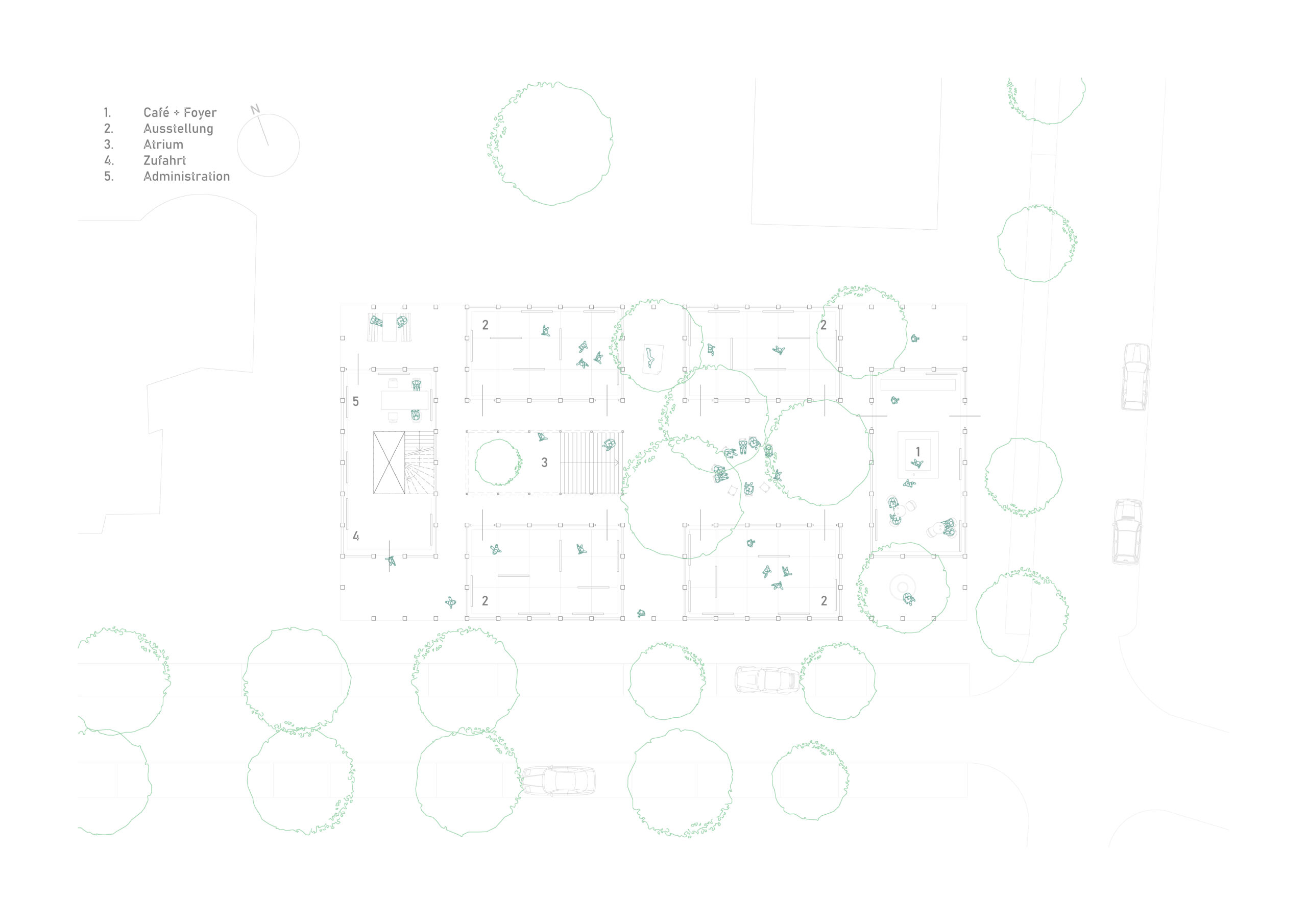 The result is a kind of perforated block edge, which encloses a space but is still completely open. This resulting courtyard can therefore be accessed from several places and serves as an access space to the individual blocks, most of which serve as exhibition space. As already mentioned, this access space is also continued into the basement and extends the general space. Quieter and more secluded functions, such as reading or archiving documents, will also take place here.