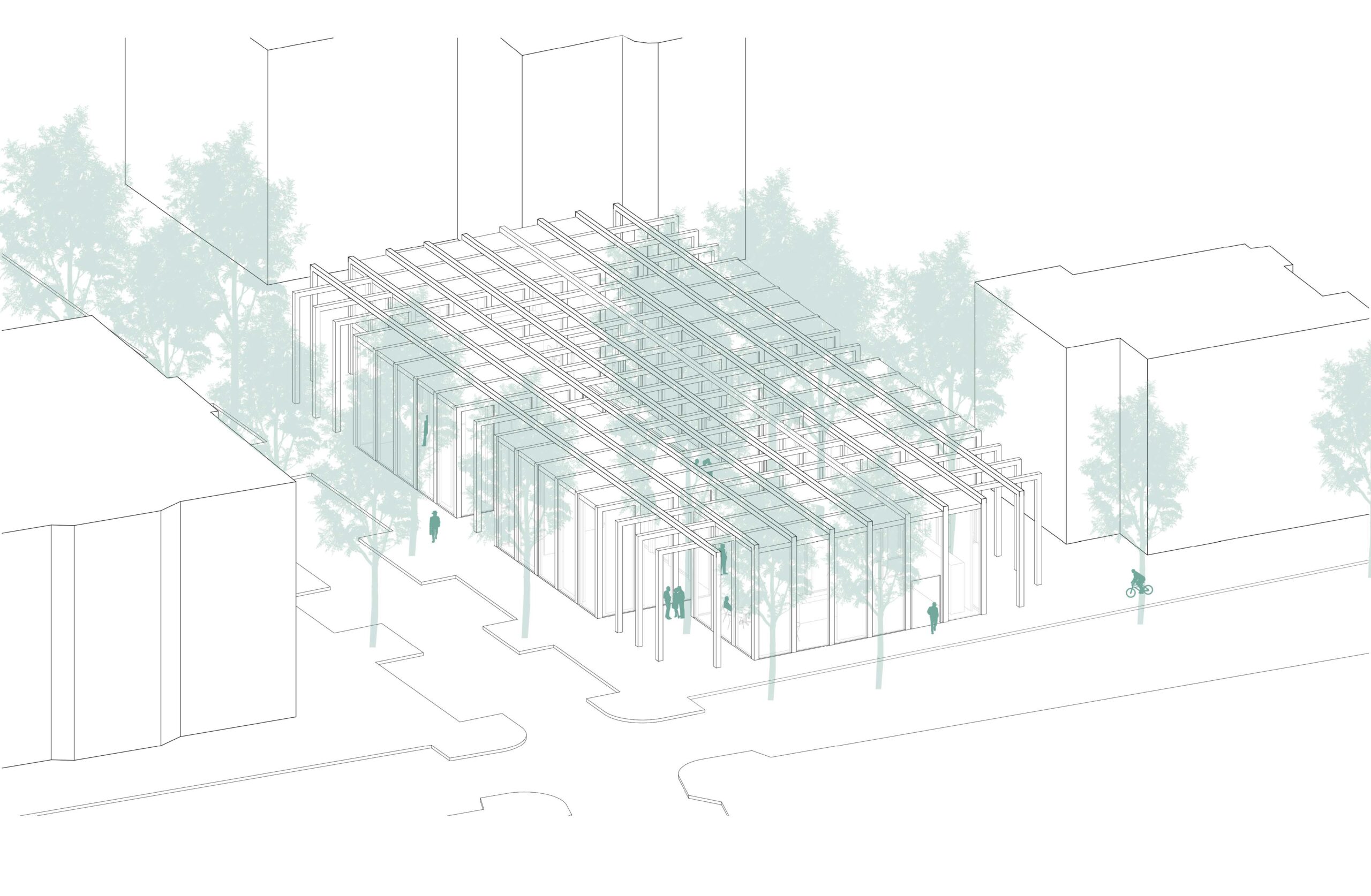 With this configuration of grid and individual bricks, we tried to challenge the boundary between inside and outside. There is thus a visual boundary with the grid, which is intended to be reminiscent of a forest through the choice of wood as a material. The individual blocks themselves, however, do not distance themselves from this event, because they are supposed to appear inviting through their full glazing, as if they were already part of the overall space.