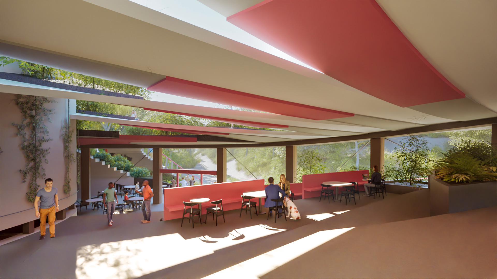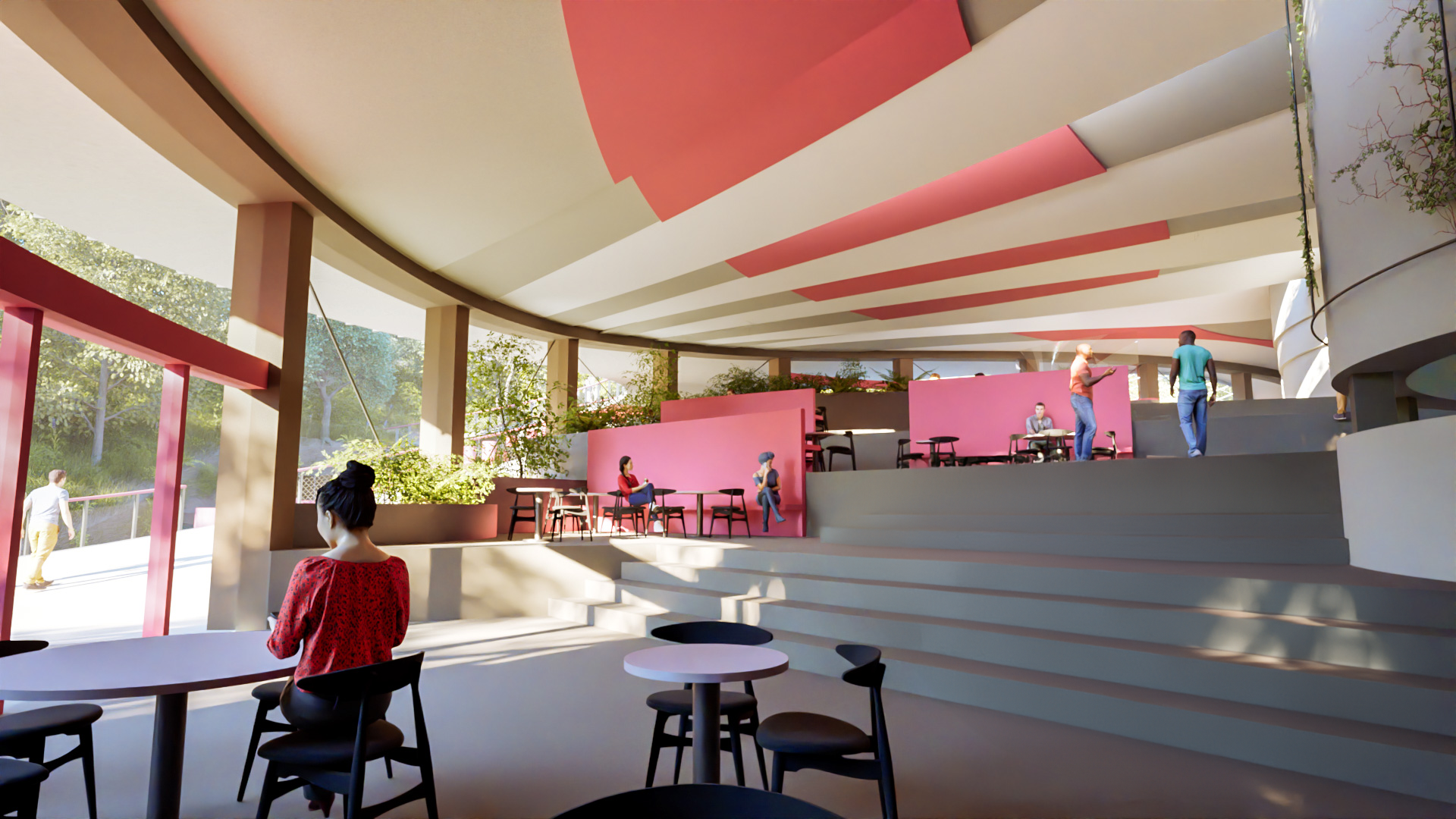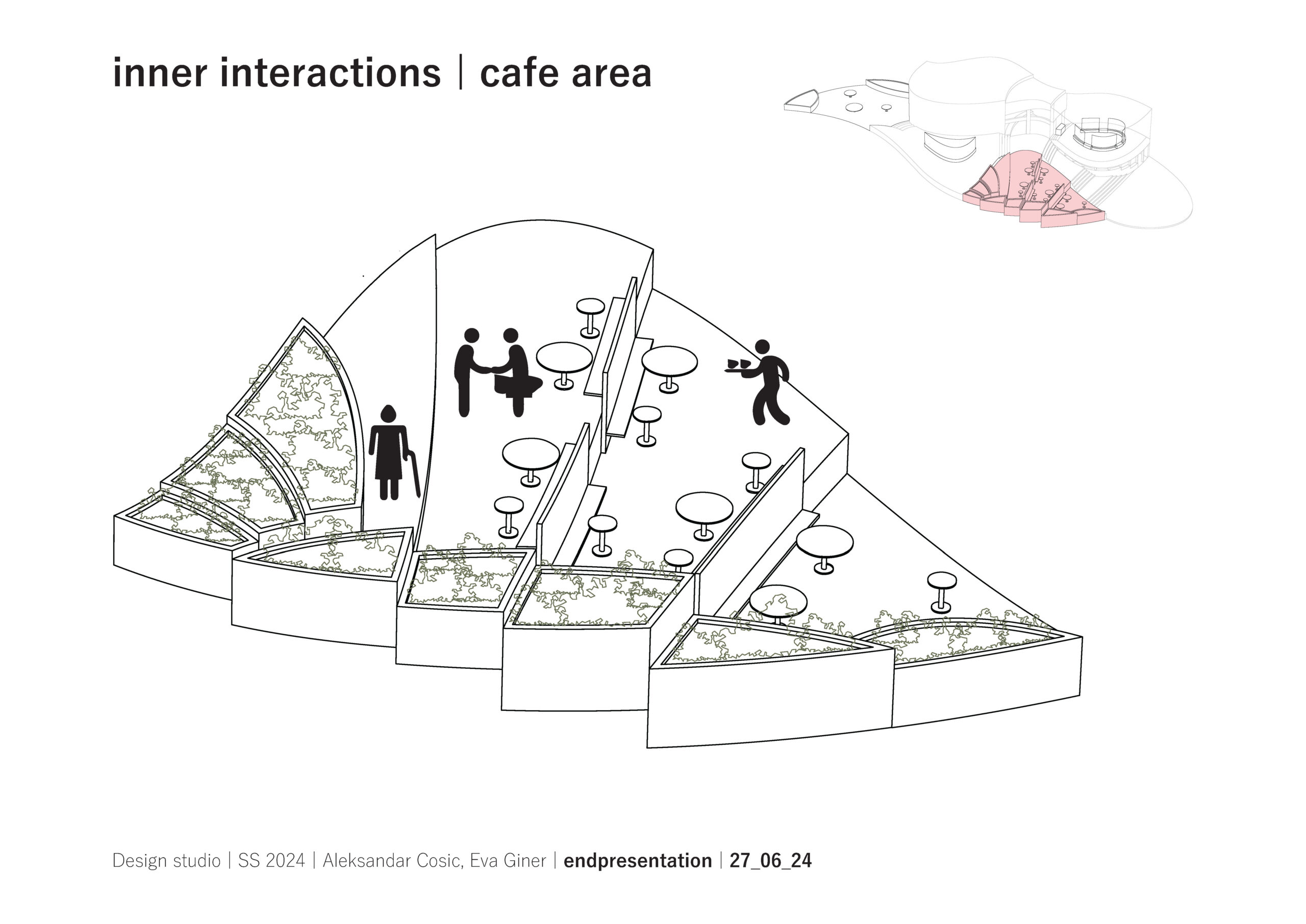 Eventhough the path on the outside is derived from the existing one, it got extended to two floors to maximize the connection between the building and the outside space. What also becomes noticeable is how the terracing plays a big role in dividing spaces without resorting to walls.