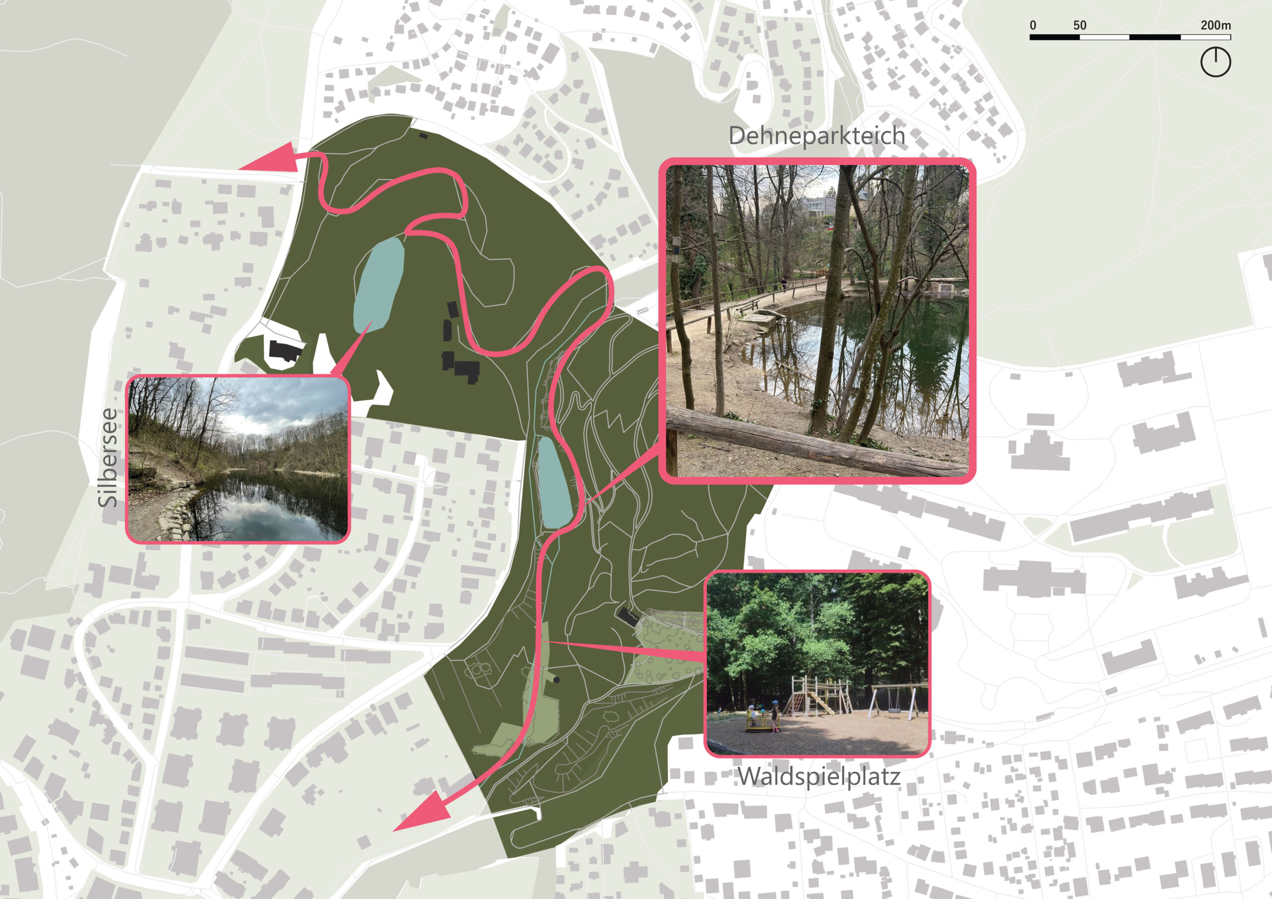 Along this path one walks through quite a large forest area, considering the density of Vienna. This forest is used as a recreational space mostly by locals. In includes a park for children and two waterbodies, the Silbersee and the Dehneparkteich, which caught our attention.