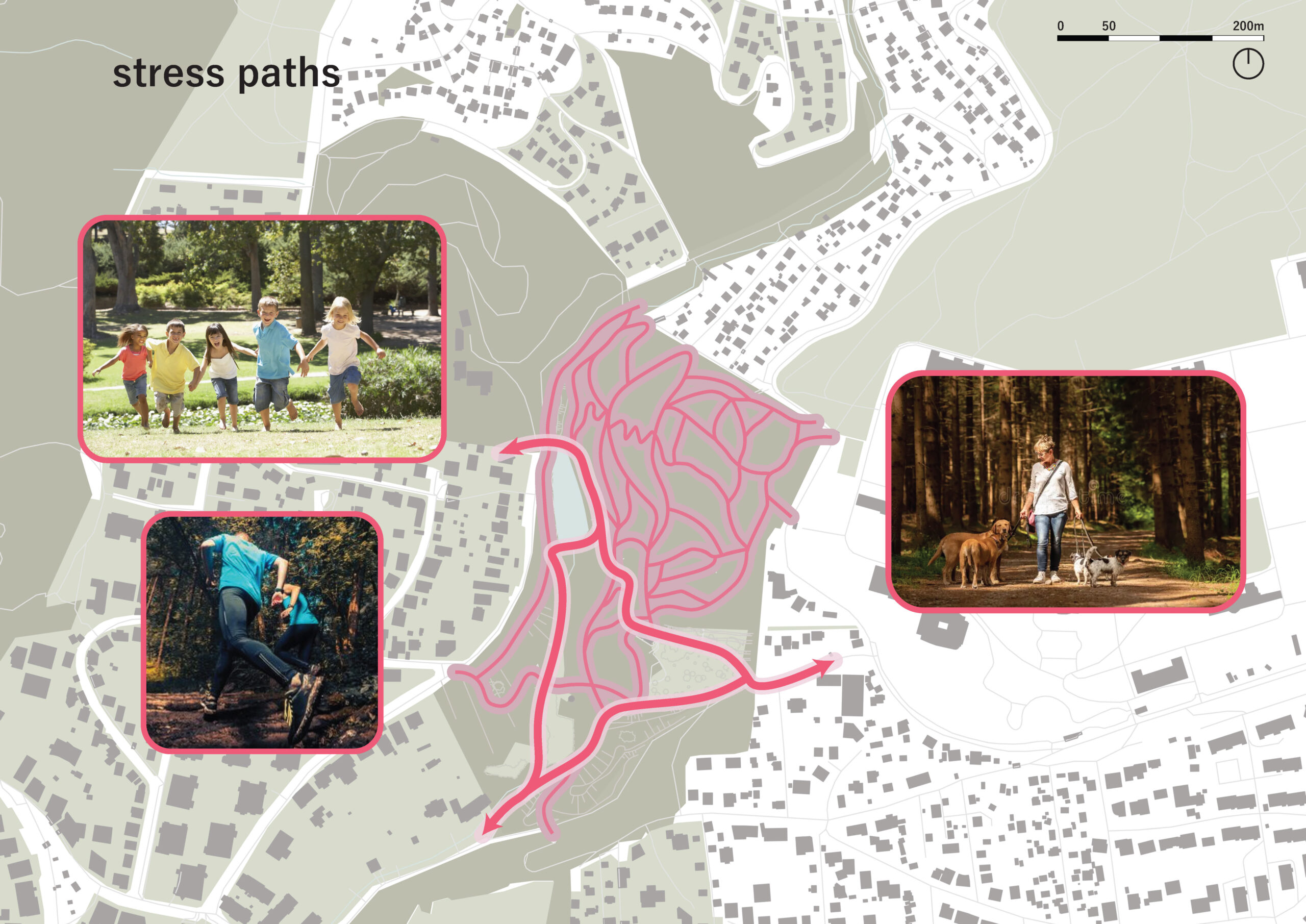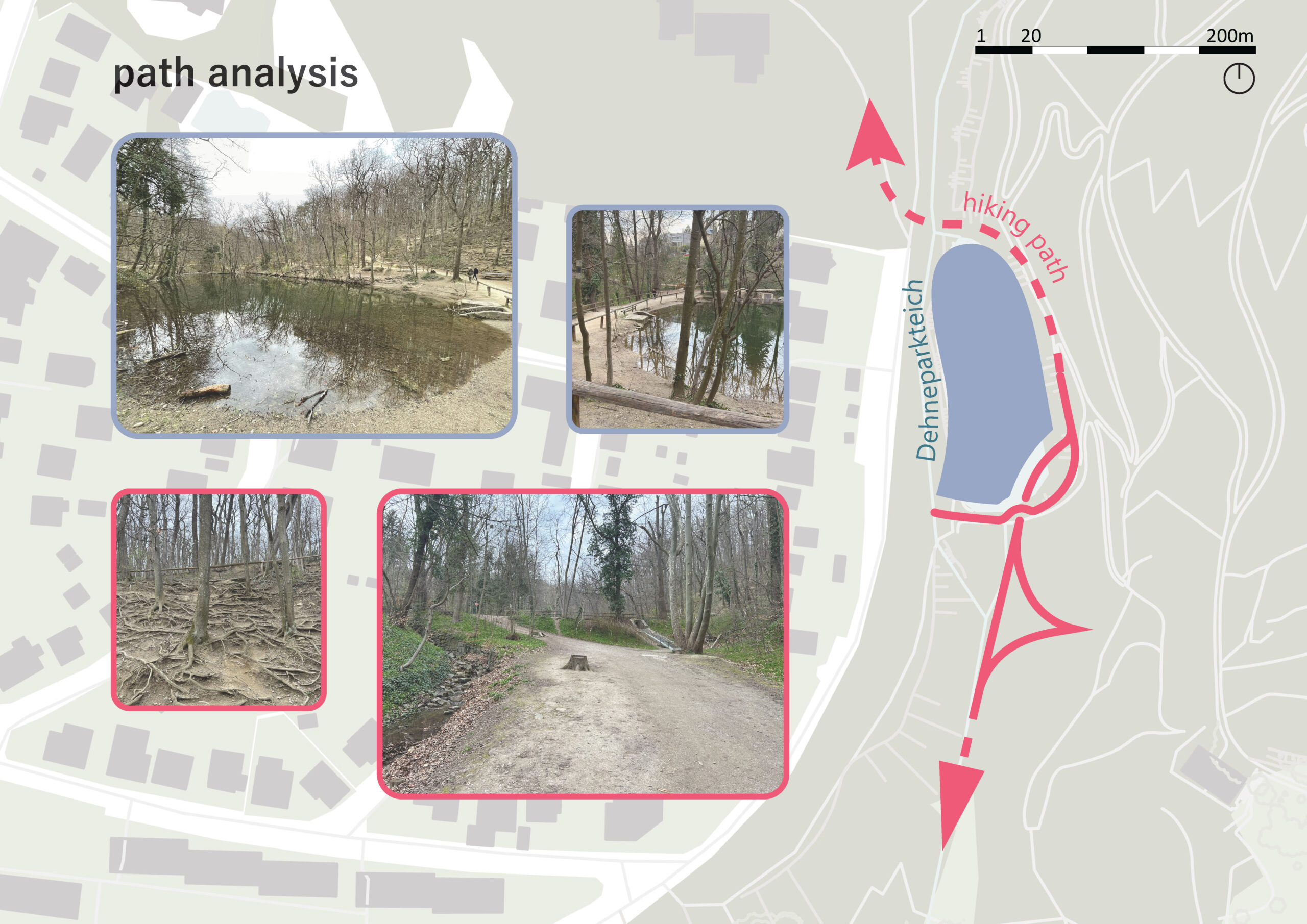 Taking an even closer look at the hiking trail, we took an interest in understanding how and why the paths intersect in the way they do at the dehneparkteich and if this can be improved. This understanding of movement and adjacent areas of interest played a big role in the formgiving process. As already mentioned the soil is very tramped down and therefore infertile, because of the inability of water absorption and damage. This leads to a whole chain reaction of problems regarding the health of the forest.
