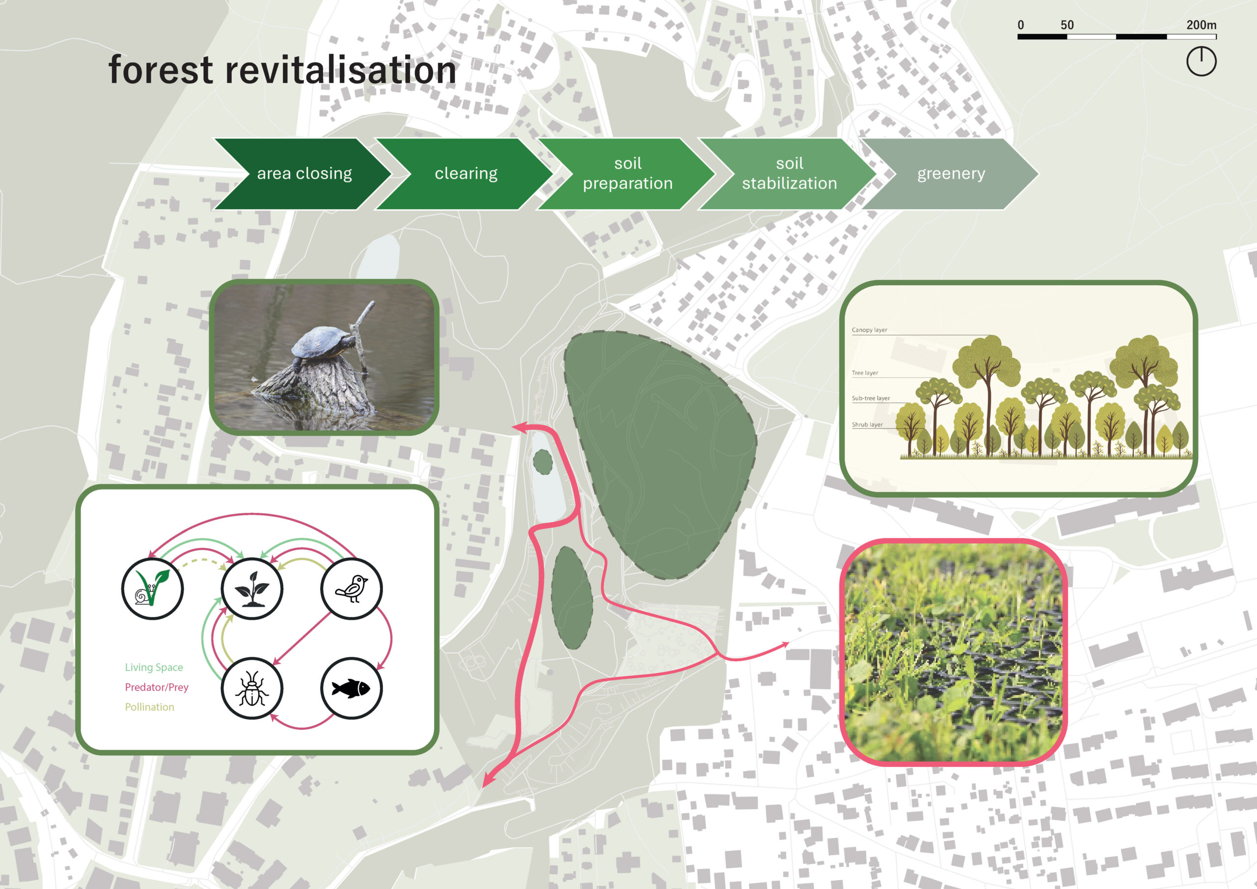 Unfortunately the local ecosystem has not been properly protected against human activities so far and the damage was noticable when visiting the site. This is an issue we tackle in multiple ways in this project. For the forest area as a whole, we plan on temporarily closing off certain parts for it to properly revitalize. This revitalization consists of, planting new trees in the fashion of tiny forest, reinforcing the ground of the main hiking path and also reducing the amount of paths for hiking, in order to ensure spaces for retreat for animals.