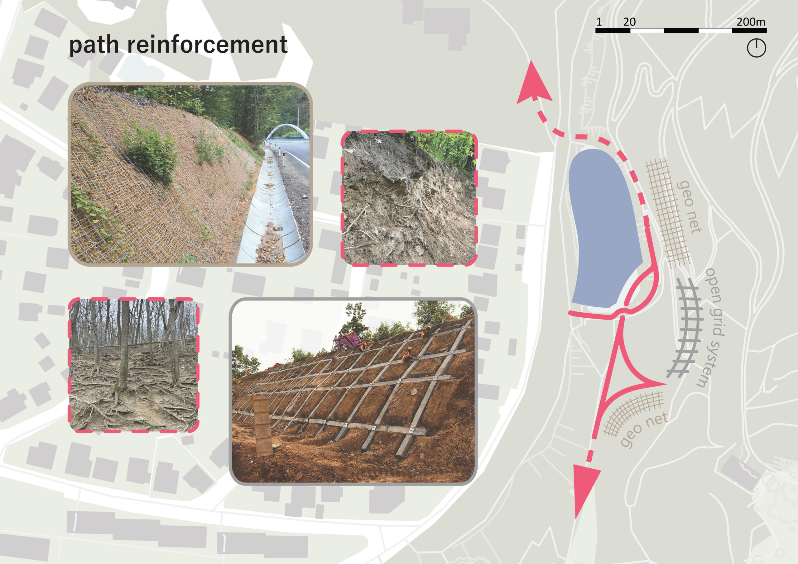 The pathways themselves are not the only parts of the ground that need protection. For the soil to be fruitful to plants and animals on slopes. on these parts we use geonets for general stabilization and an open grid beam system, that has been functionally advanced for additional purposes, which can be seen later on.