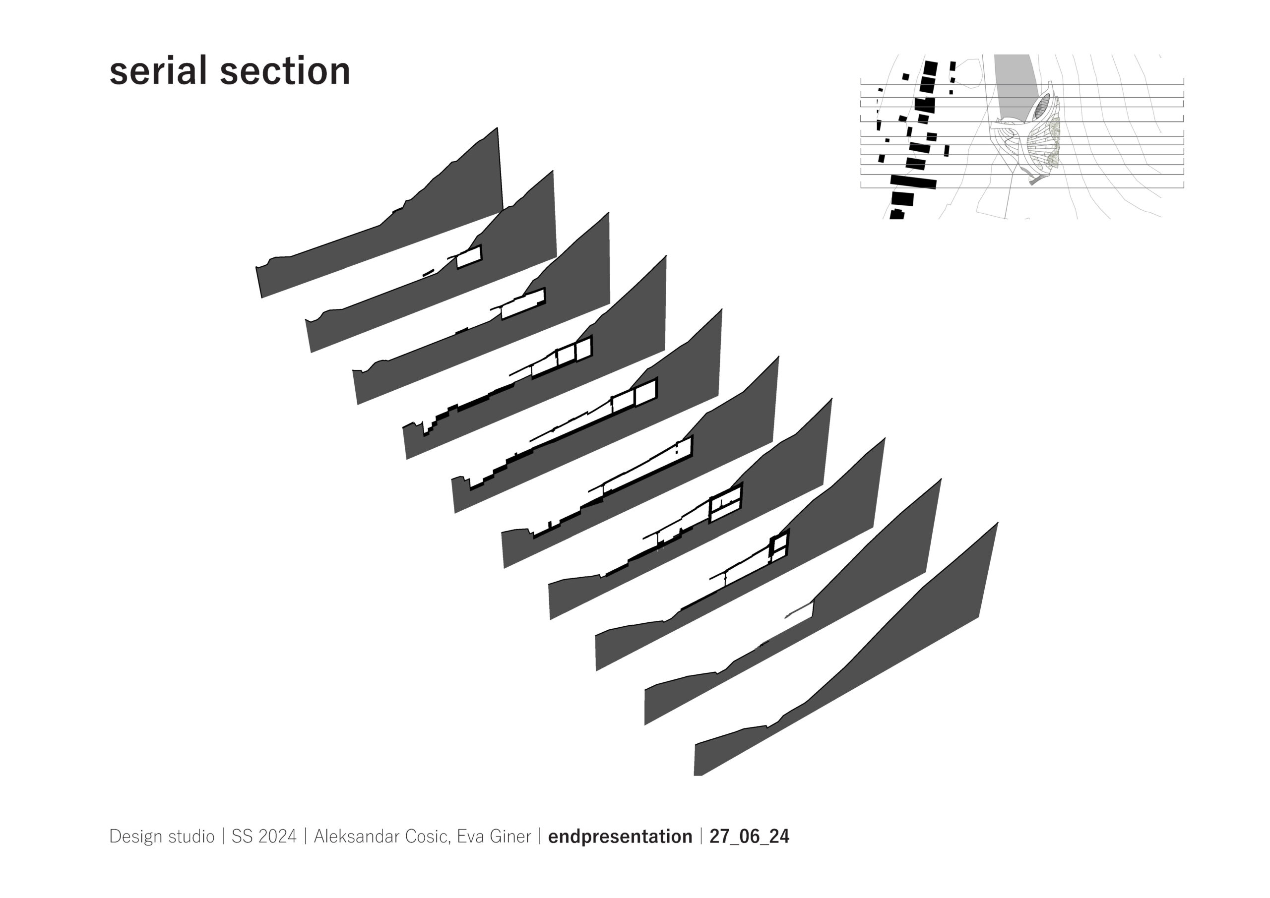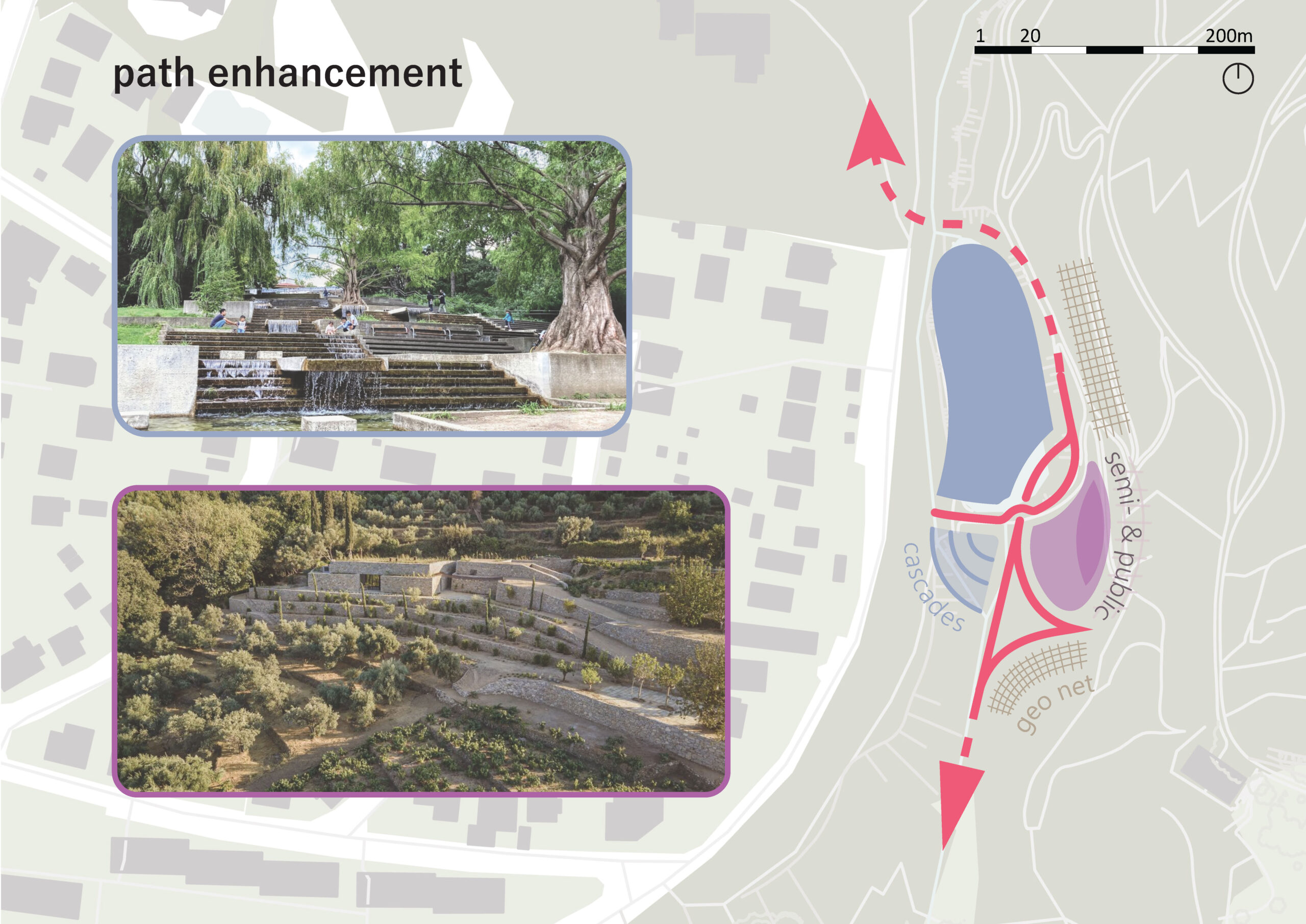 The main motive of working with the topography in this project, is terracing. It opens up the possibility of defining space, insinuating water, in the form of cascades, but also enhancing the experience of paths.