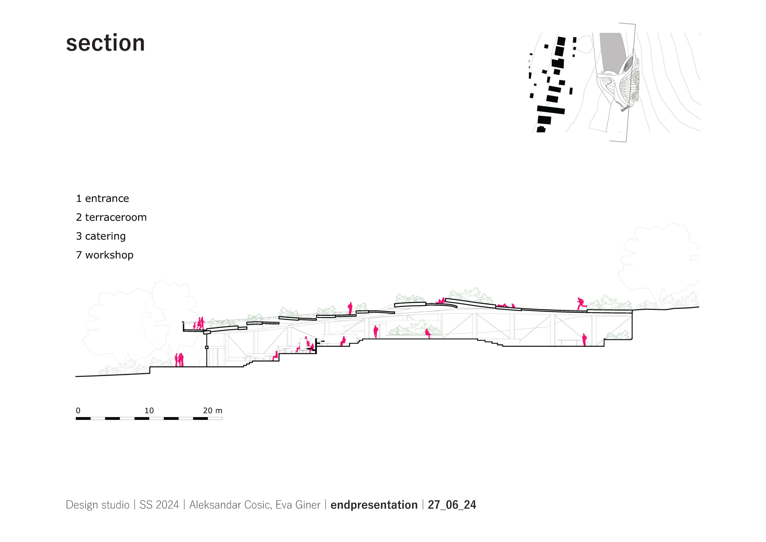 Looking at the section, one can see that we have also used the concept of compression and release in the main entrance in the middle. Open spaces for retreat are on the sides. Also the way the roof is used as a green roof but also as a seating area, can also be seen.