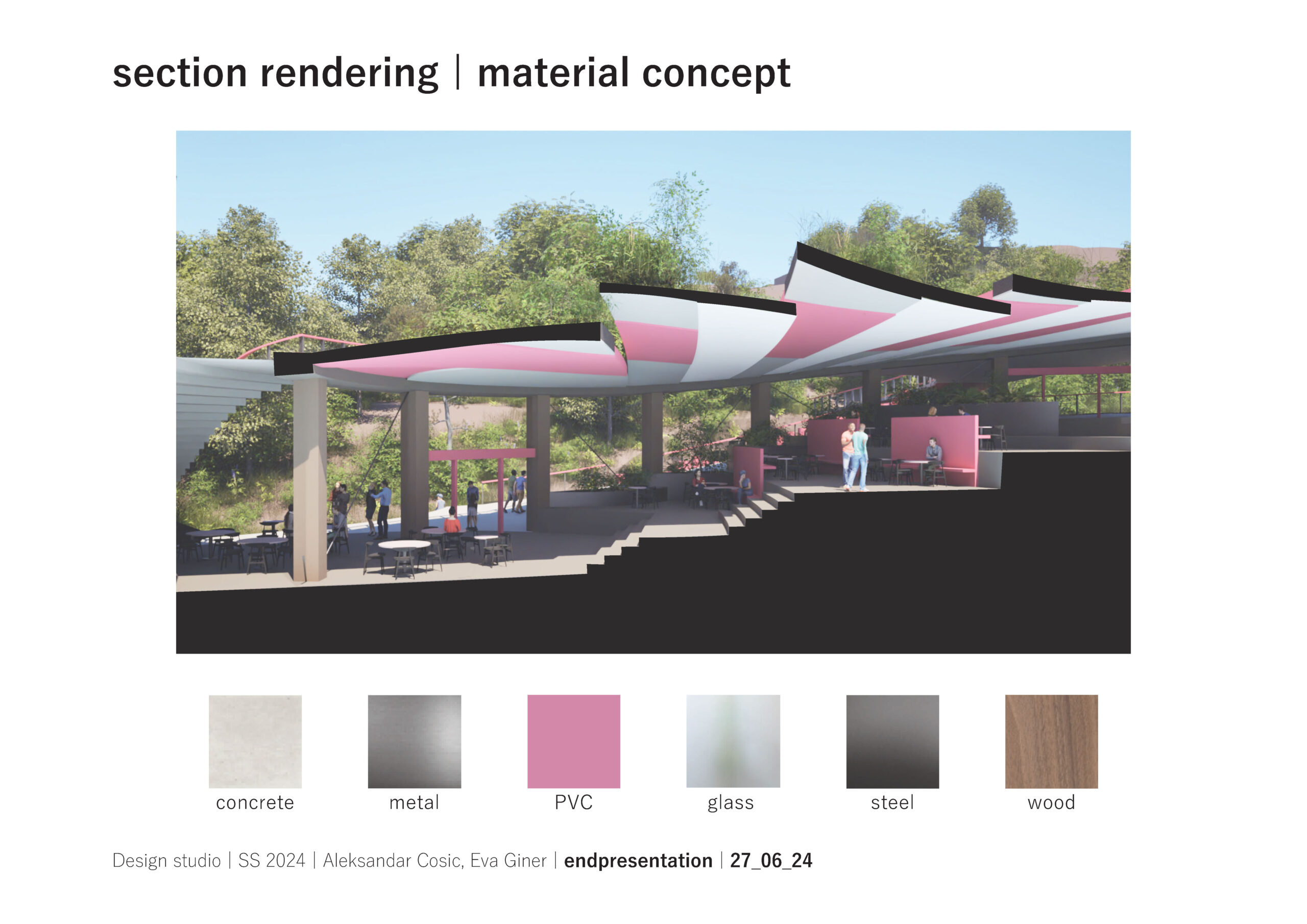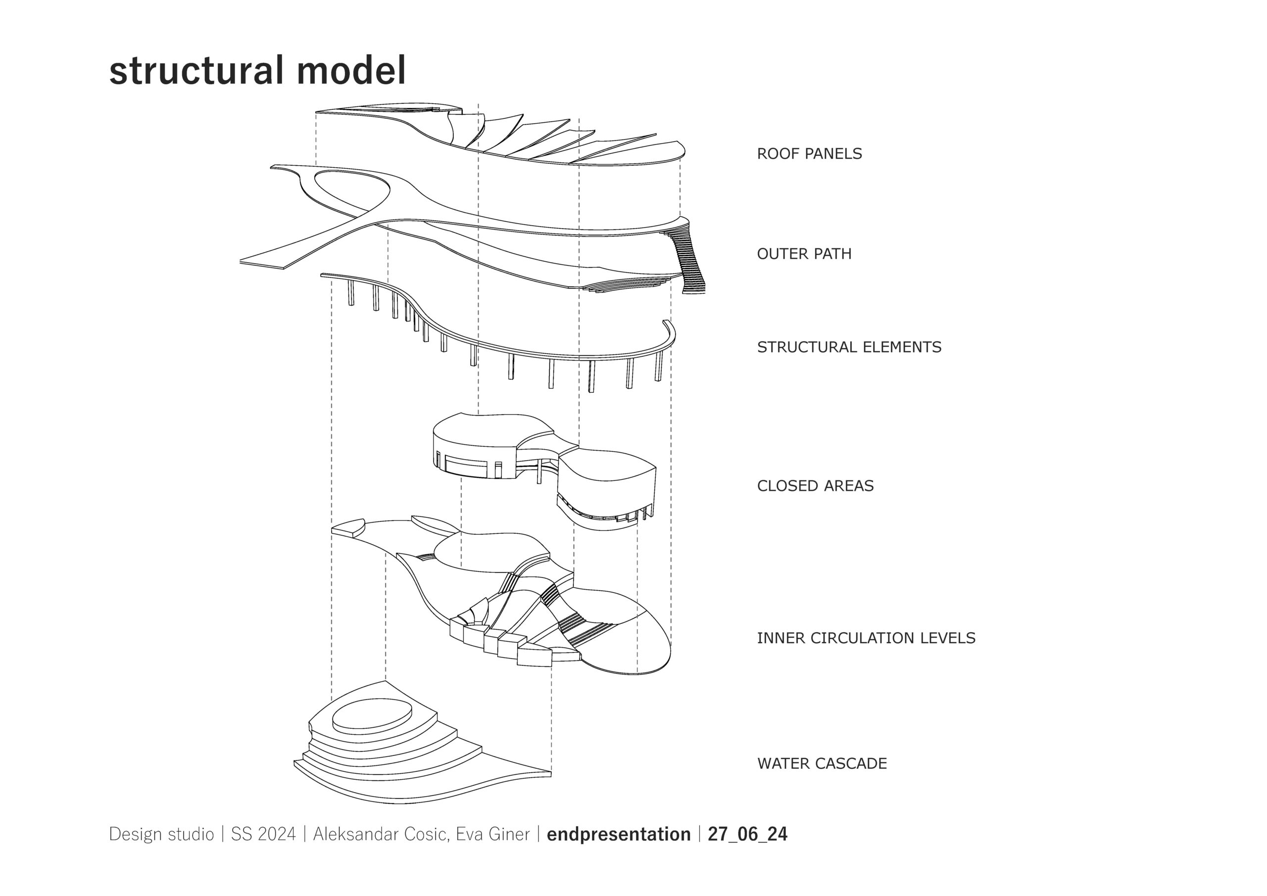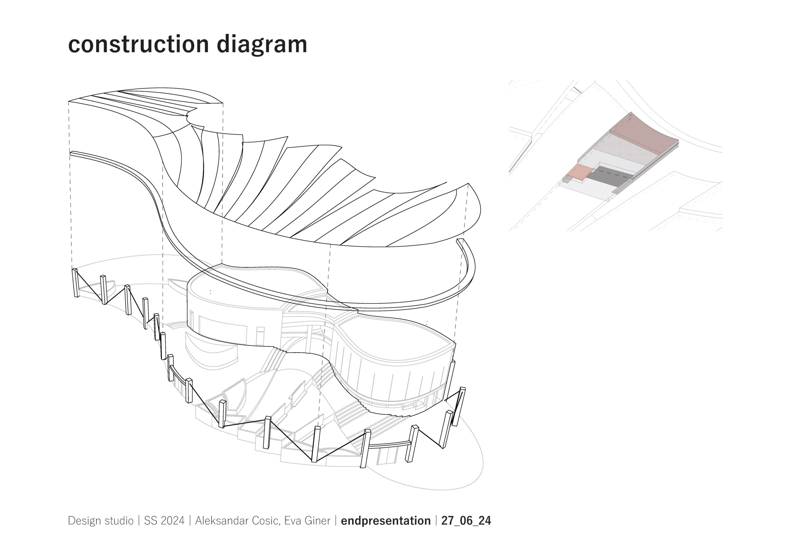 In order to realize the concepts statically, we used a hybrid system of massive cores, that are thermally insulated that connect via a lightweight and open roof to a column row, that are stiffened with steel rods.