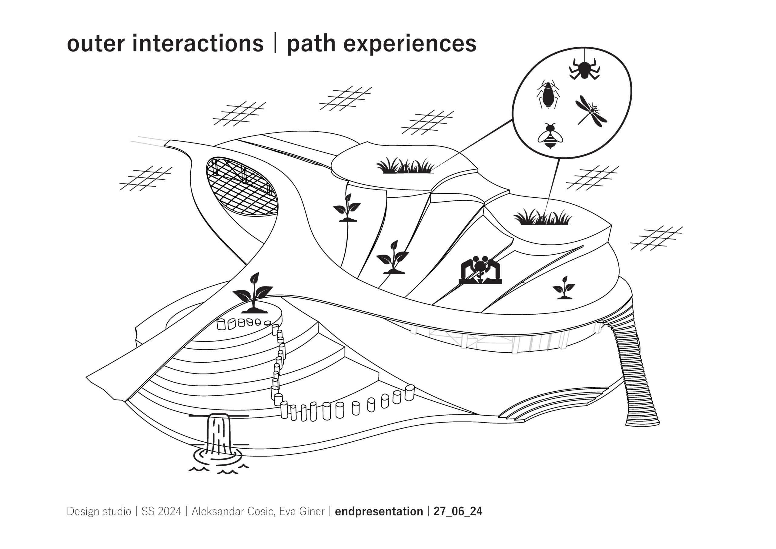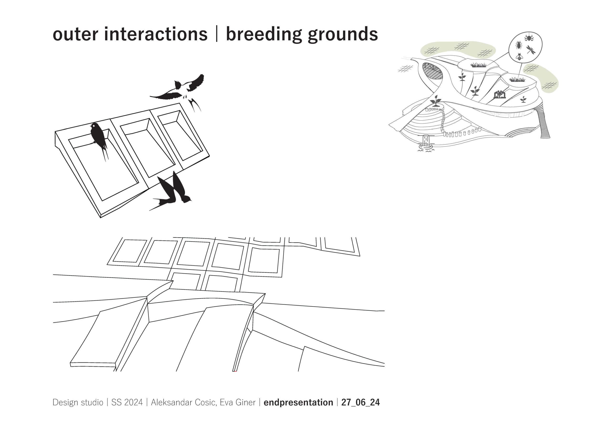 For the outer interactions, we concluded that we wanted to further enhance the experience of the Dehneparkteich, add the ability of urban gardening but also to give animals their own space to use, such as integrated breeding grounds for birds.