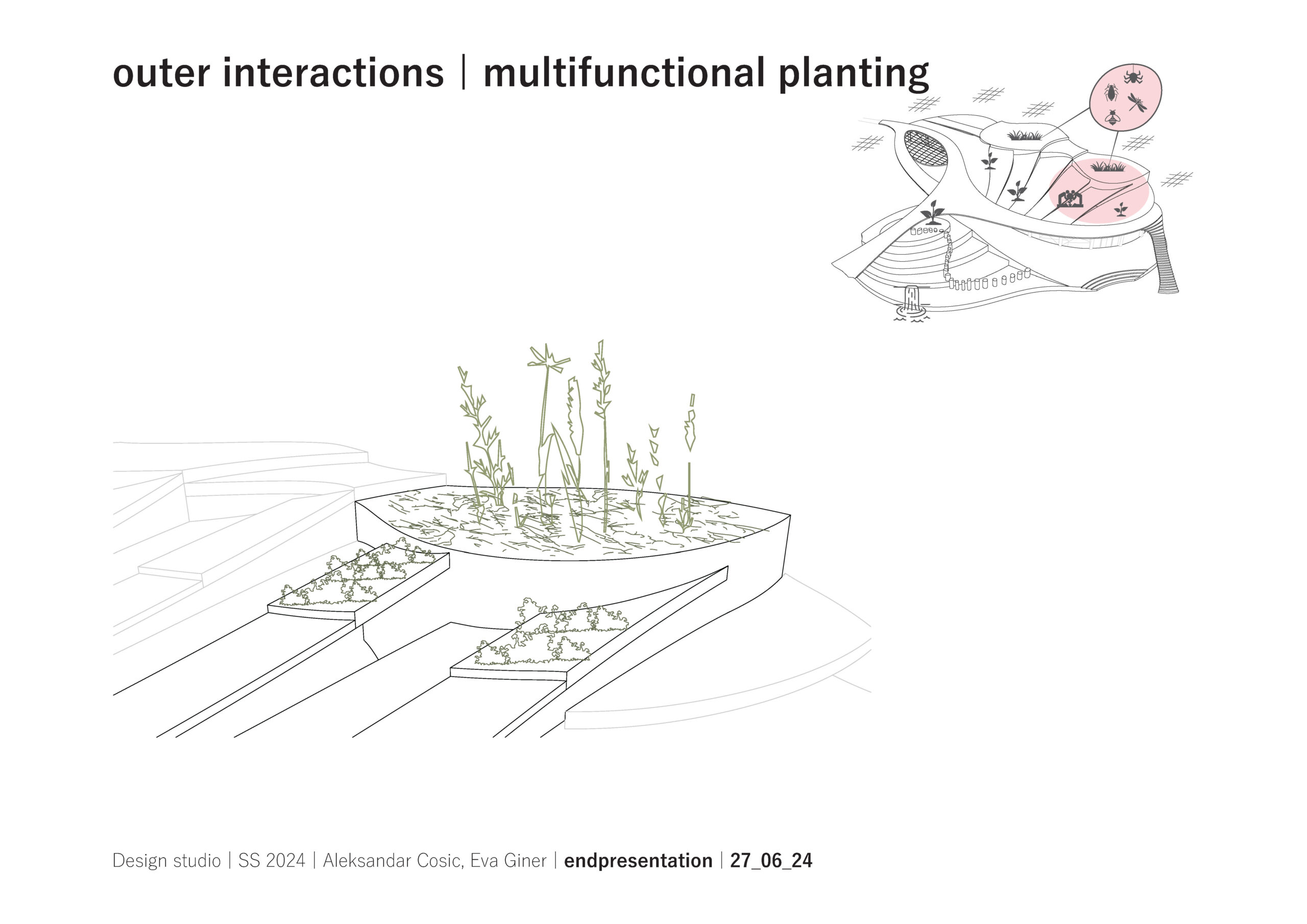 While designing the built structure, we considered multiple ways of planting methods and what usages they serve. We decided to separate the planting scheme into two strategies. one is mainly for the ecosystem, that are protected with borders to humans. The other is mostly for human uses such as consumption or smell.